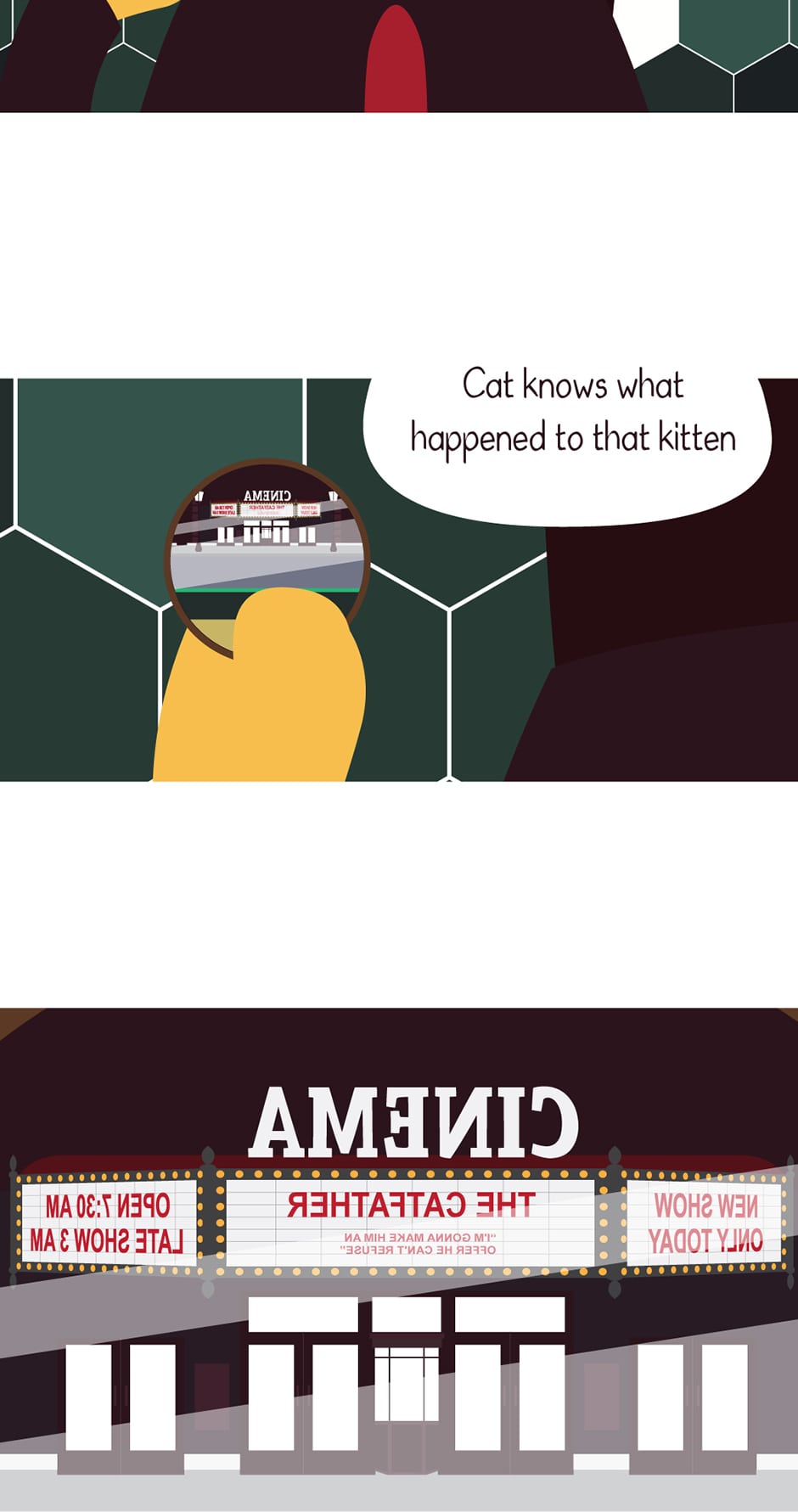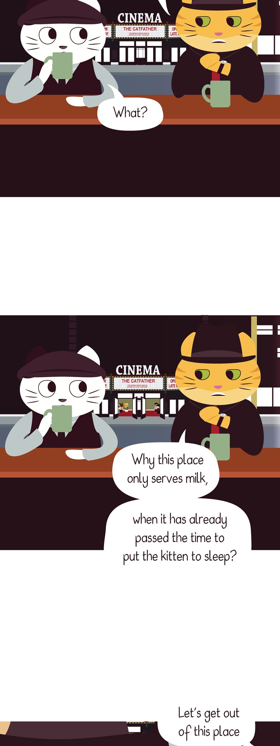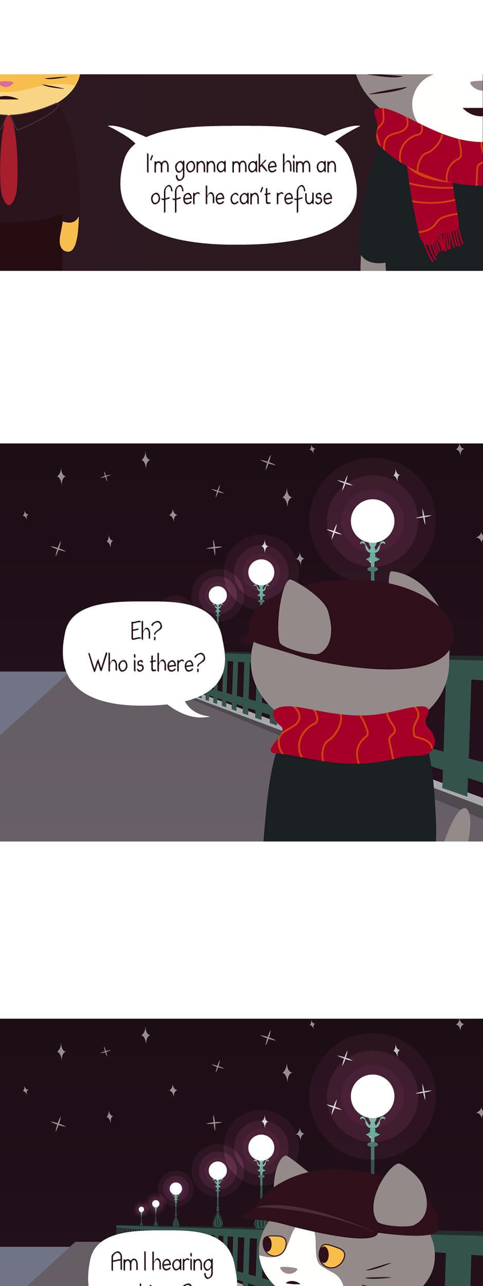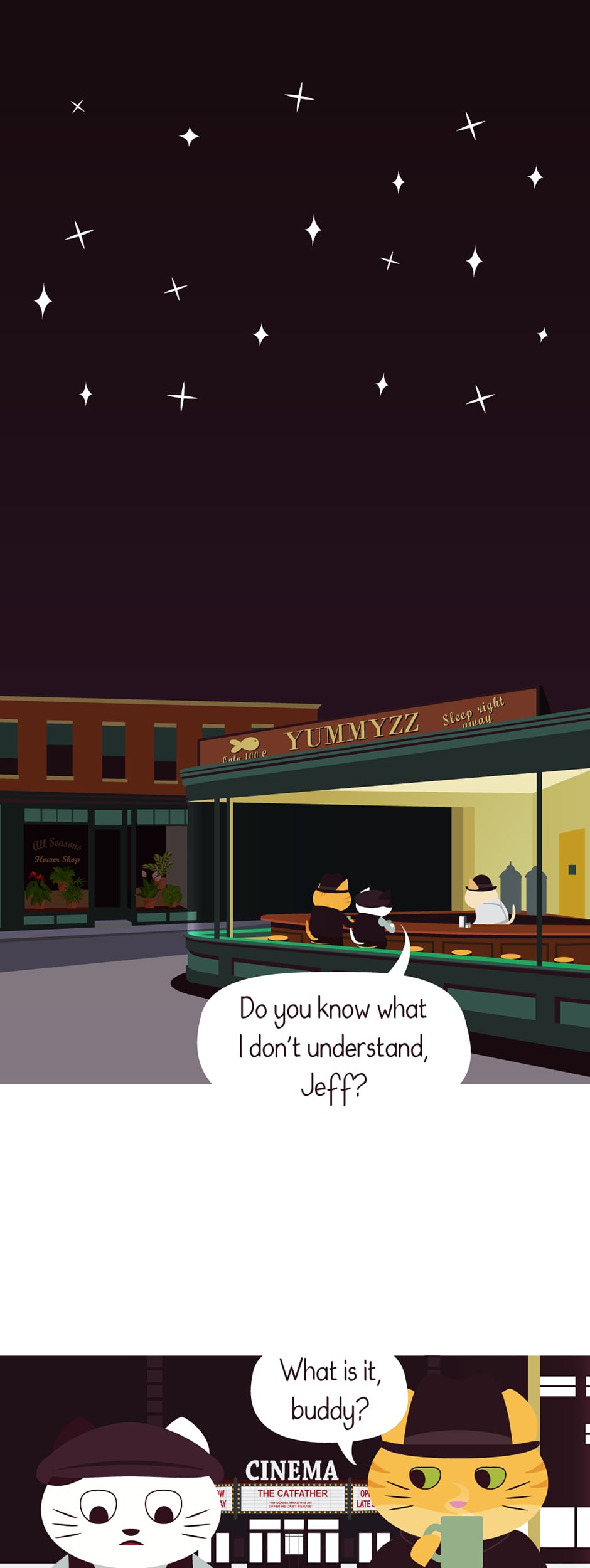 Do you know what I don't understand, readers? . . Why do I keep re-reading this episode over and over again? References in this episode: - Nighthawks (1942) by Edward Hopper - A Clockwork Orange (1971) - The Godfather (1972) - Taxi Driver (1976) PS: I'm changing the minimum of panels to 17-ish, this way I can have more time to work on the backgrounds hm