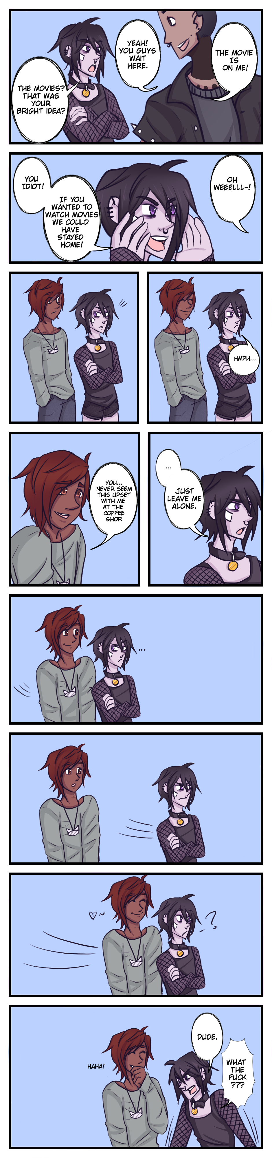 A slice of life comic about two best friends. Micha, a goth, unemployed, temperamental guy with terrible taste in guys and Leo, an all around nice guy with little relationship experience just trying to keep his head above water. Both strange people trying to live normal lives.