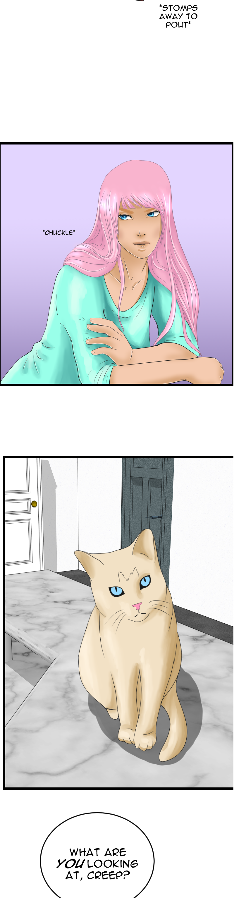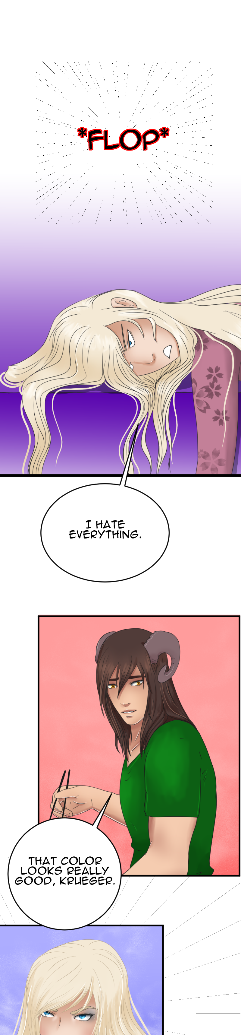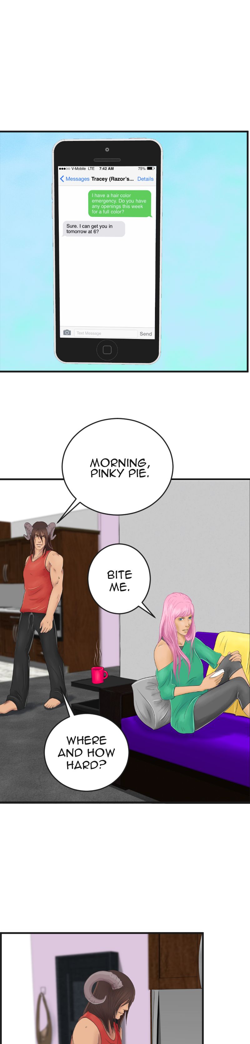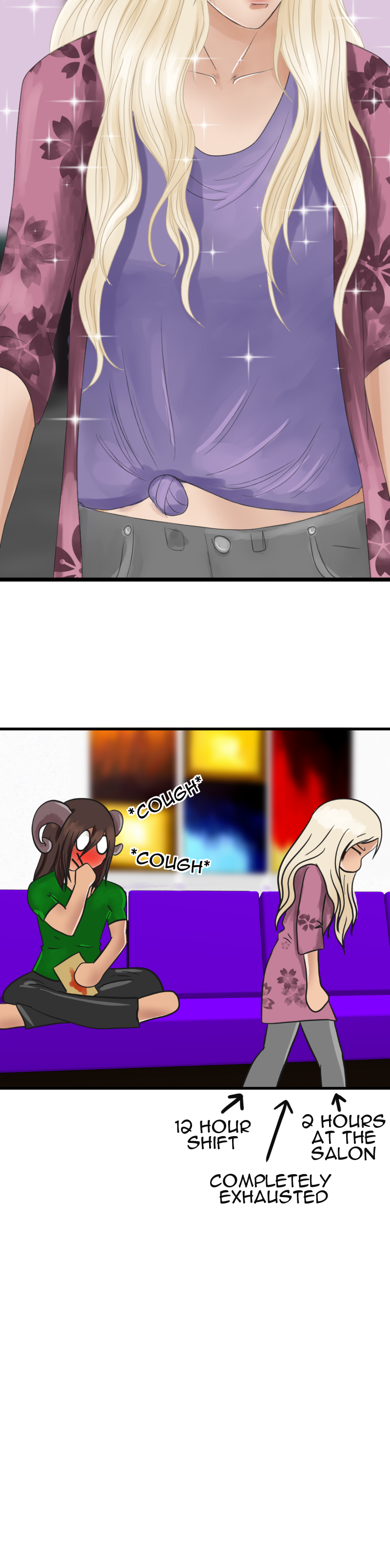 I love the coughing fit. That is so very real to life. And the sparklies when he sees her not just without pink hair, which was adorably cute, though undeniably pink, but... platinum blonde? Absolutely adorable. Thank you.