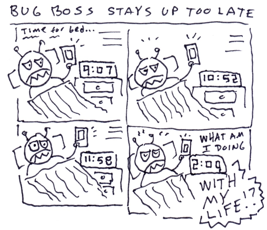 Bug Boss manages to get into bed at a reasonable hour. But it's hard to sleep when you're distracted by technology!
