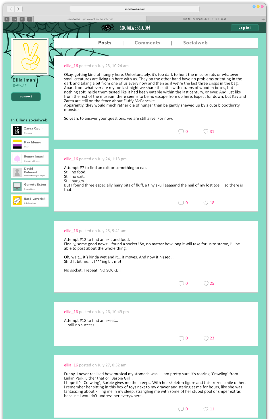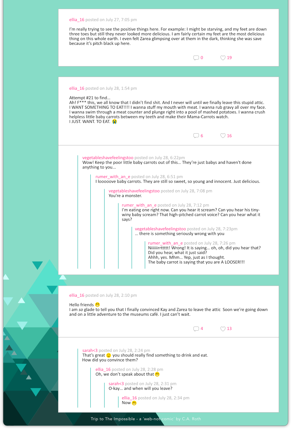 After a couple of rough days Ellia can finally convince Zarea and Kay to leave the attic and a strange hashtag is taking over the internet: #thinkofthecarrots