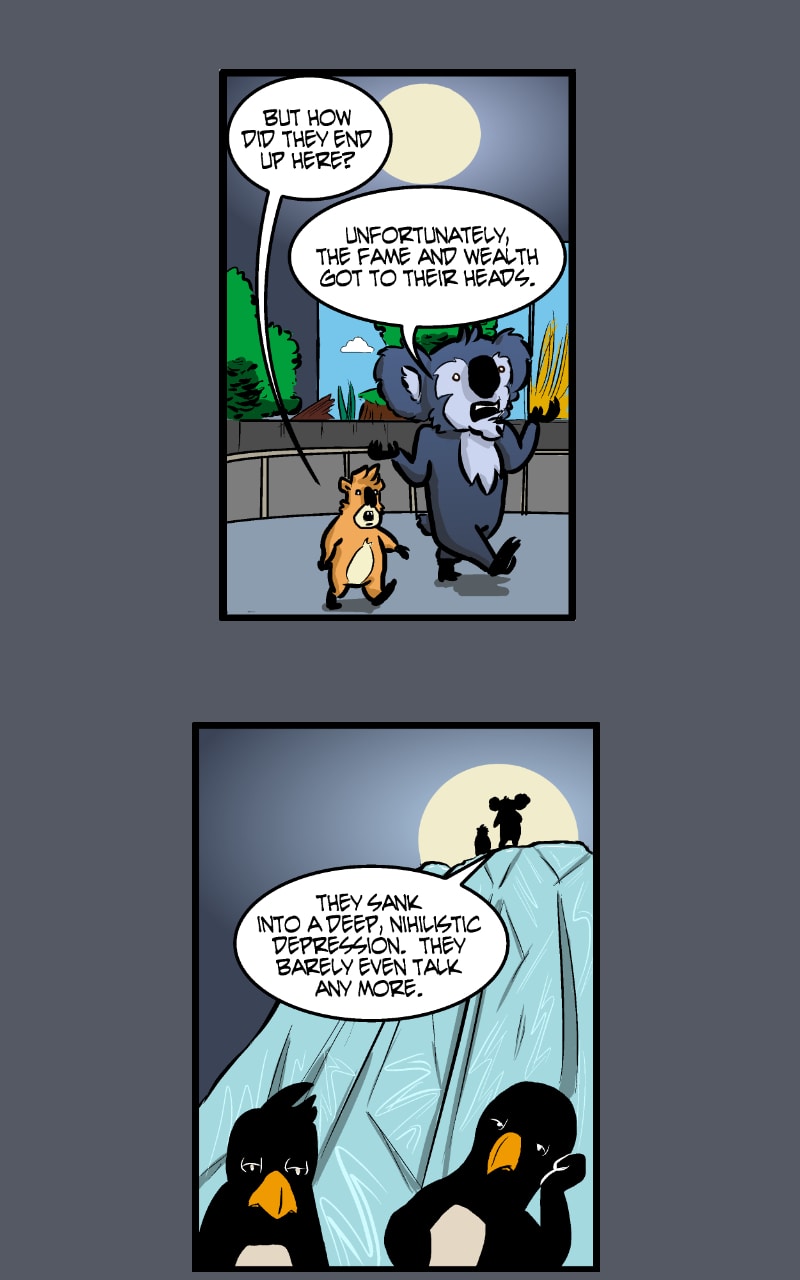 The Springdale Sanctuary is home and refuge for the unfortunate animals who lack the skill to be returned to the wild. Lulu, a hyrax and former illegal pet, is new to the Sanctuary. Her penmate is Muffin, a koala and former test animal with a hero complex. Together they face a tyrannical tortoise, malcontent monkeys, pesky patrons and the ever-present gaze of a watchful warden on a quest to find identity and a meaningful place in an artificial world designed for their protection.