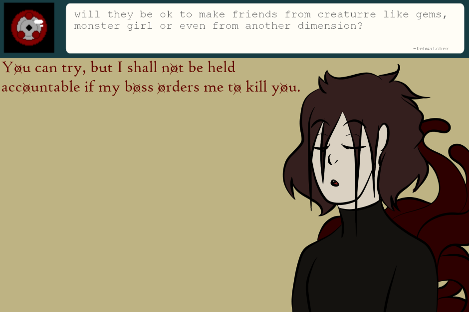Host: You can try, but I won't be held accountable if my boss orders me to kill you. Want to ask a question? Comment below or go to my DA or Tumblr. (link on my profile)