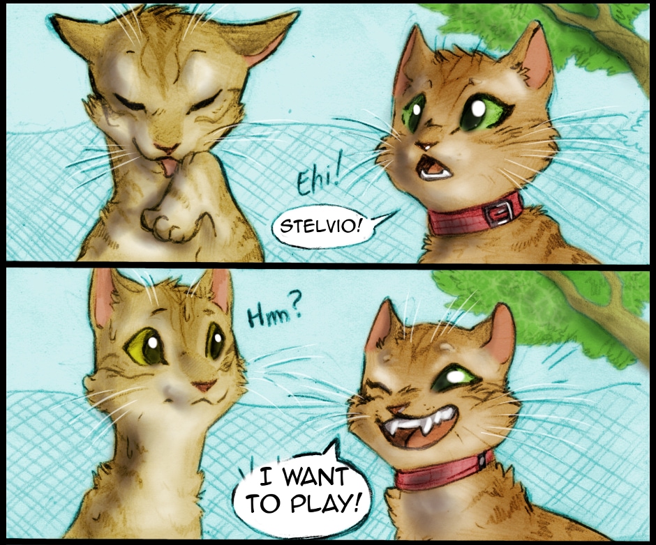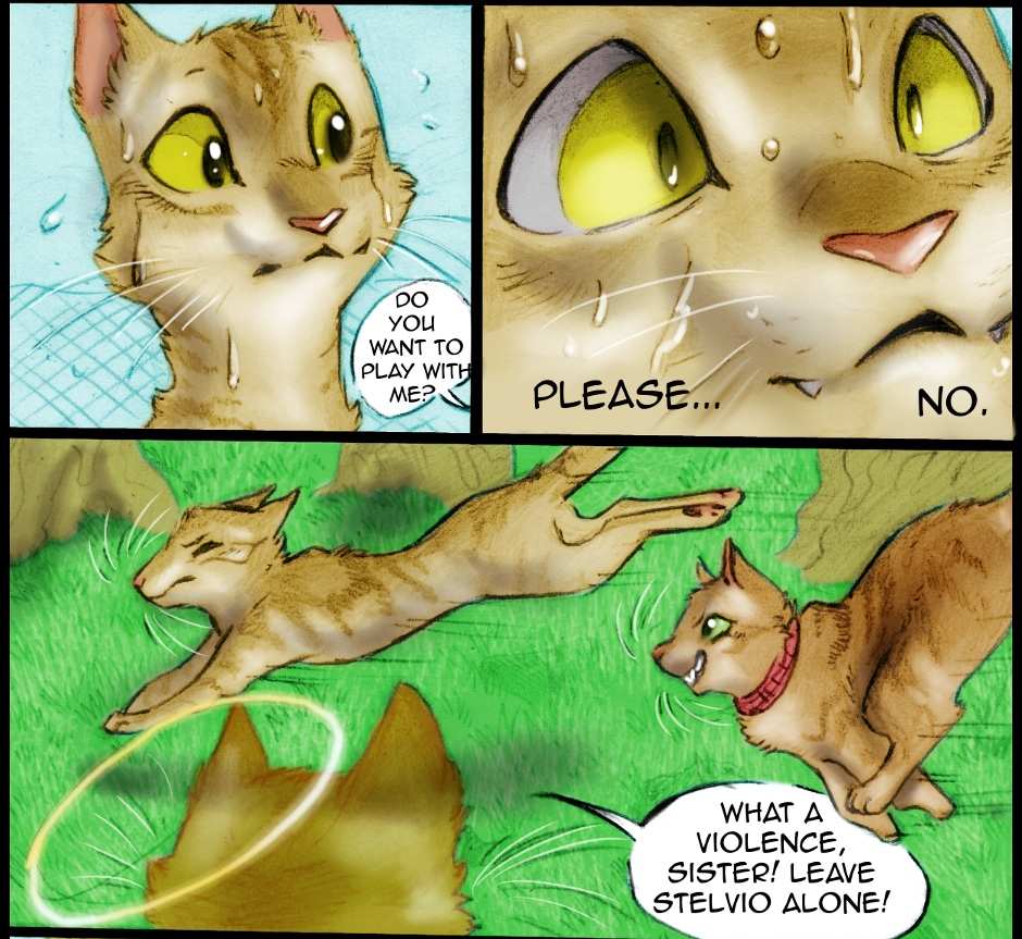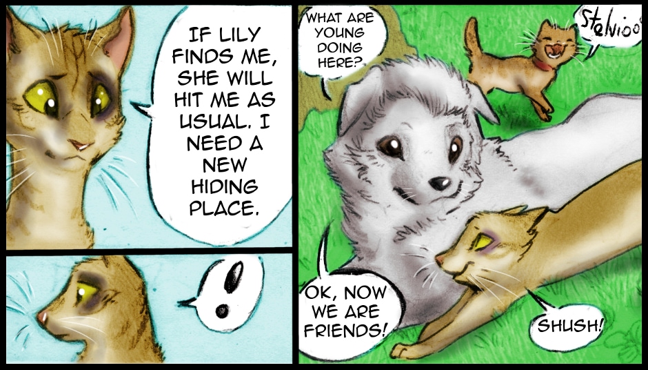Lily is a bit too violent when playing with Stelvio (which, remember, is a pacifist cat). Fortunately, there is Lucha, our Maremma sheepdog puppy: when the going gets tough, Stelvio can hide behind her.