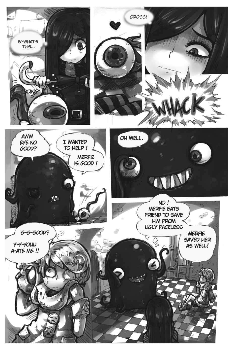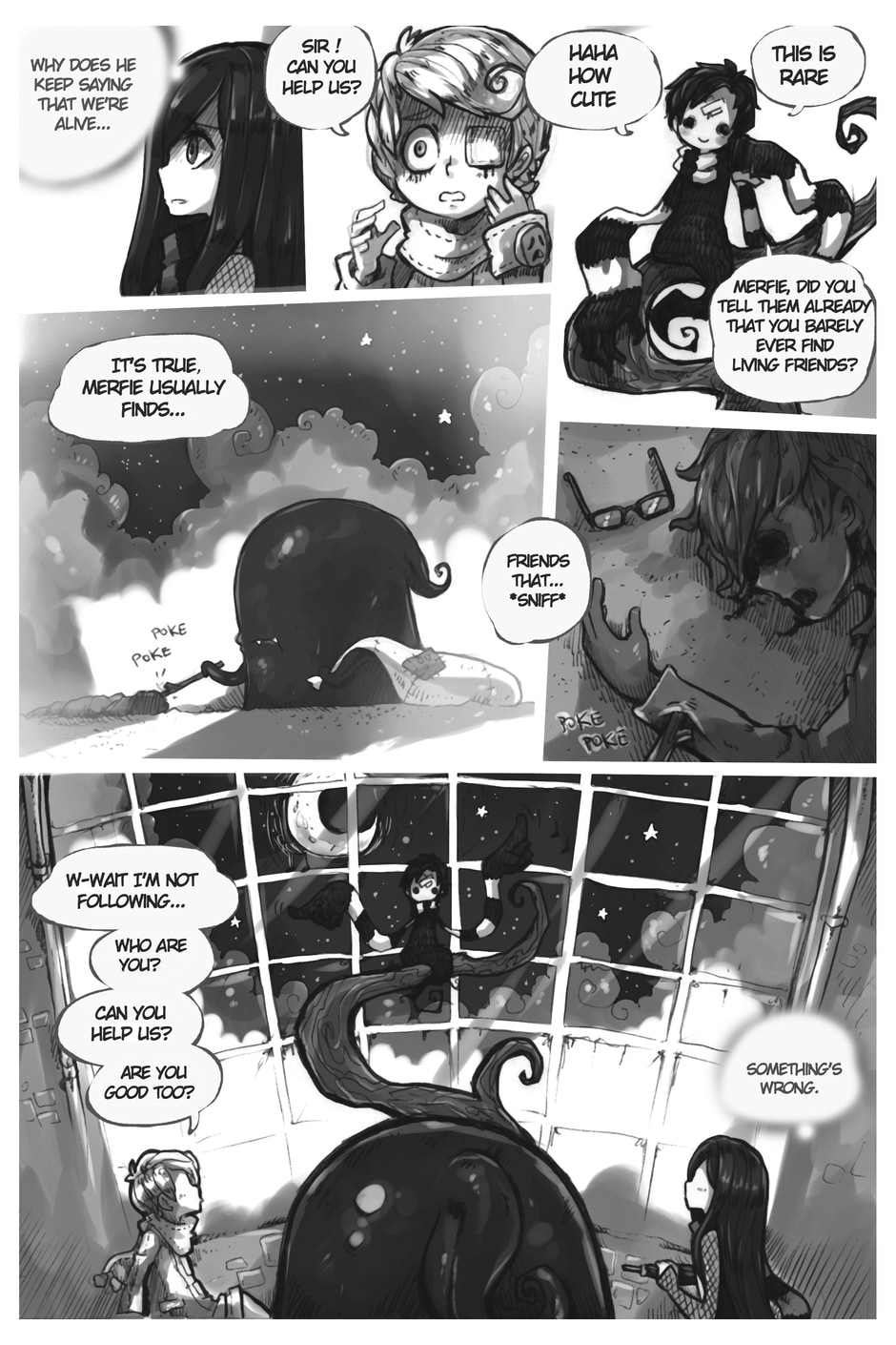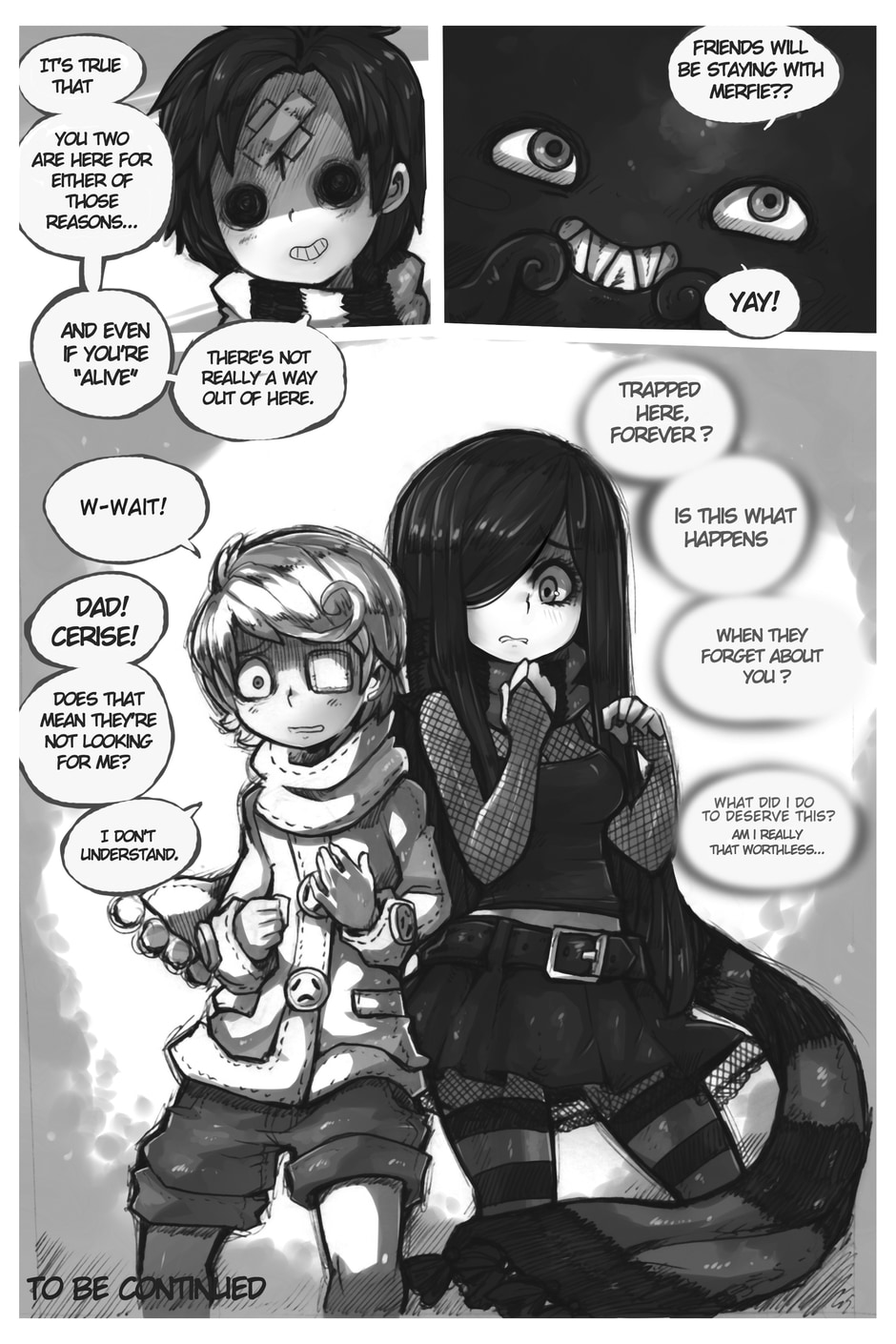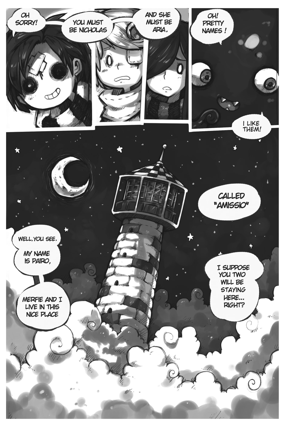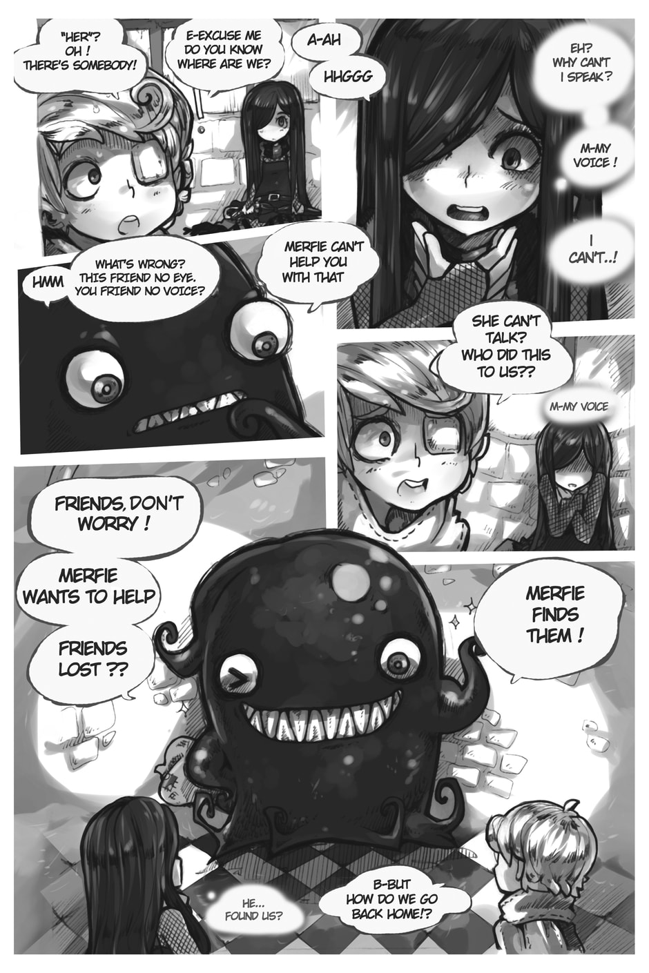 The story begins where Aria and Nicholas, very confused, meet Merfie, a monster that welcomes them to his home.