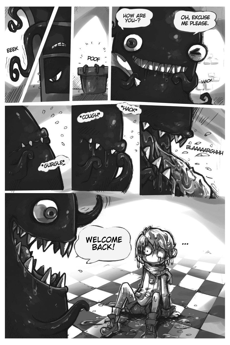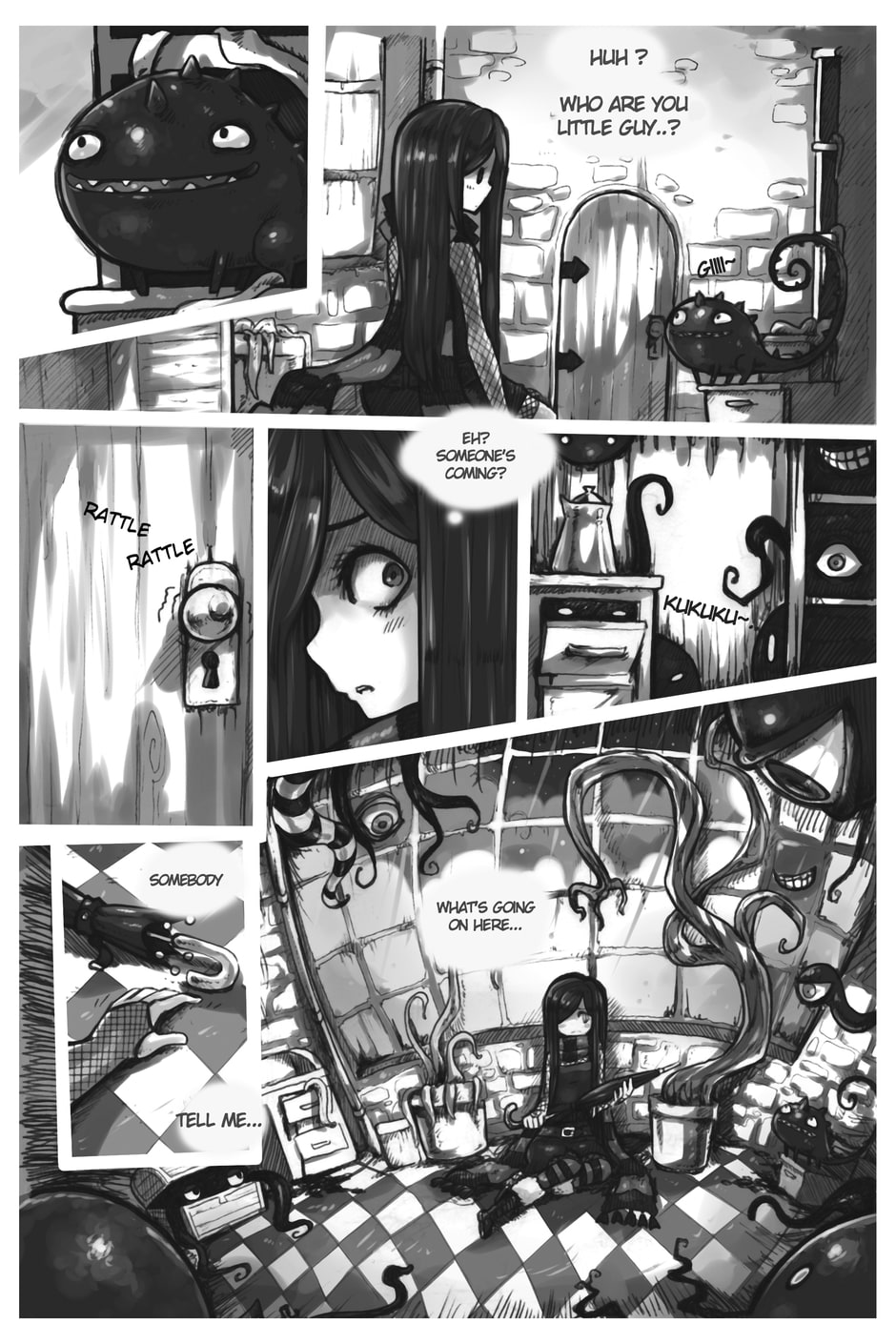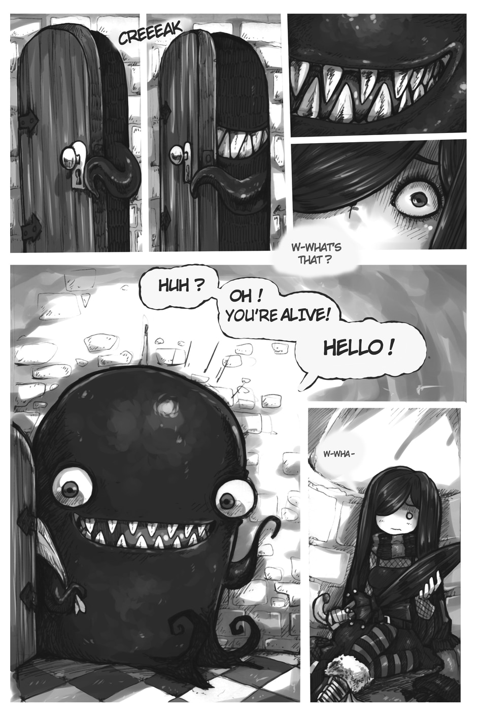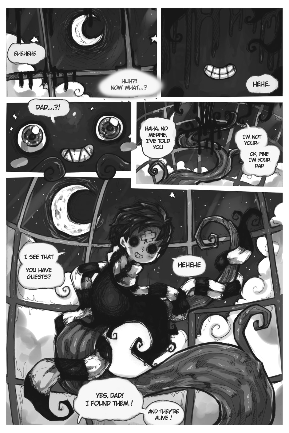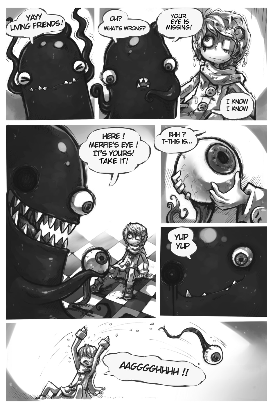 The story begins where Aria and Nicholas, very confused, meet Merfie, a monster that welcomes them to his home.