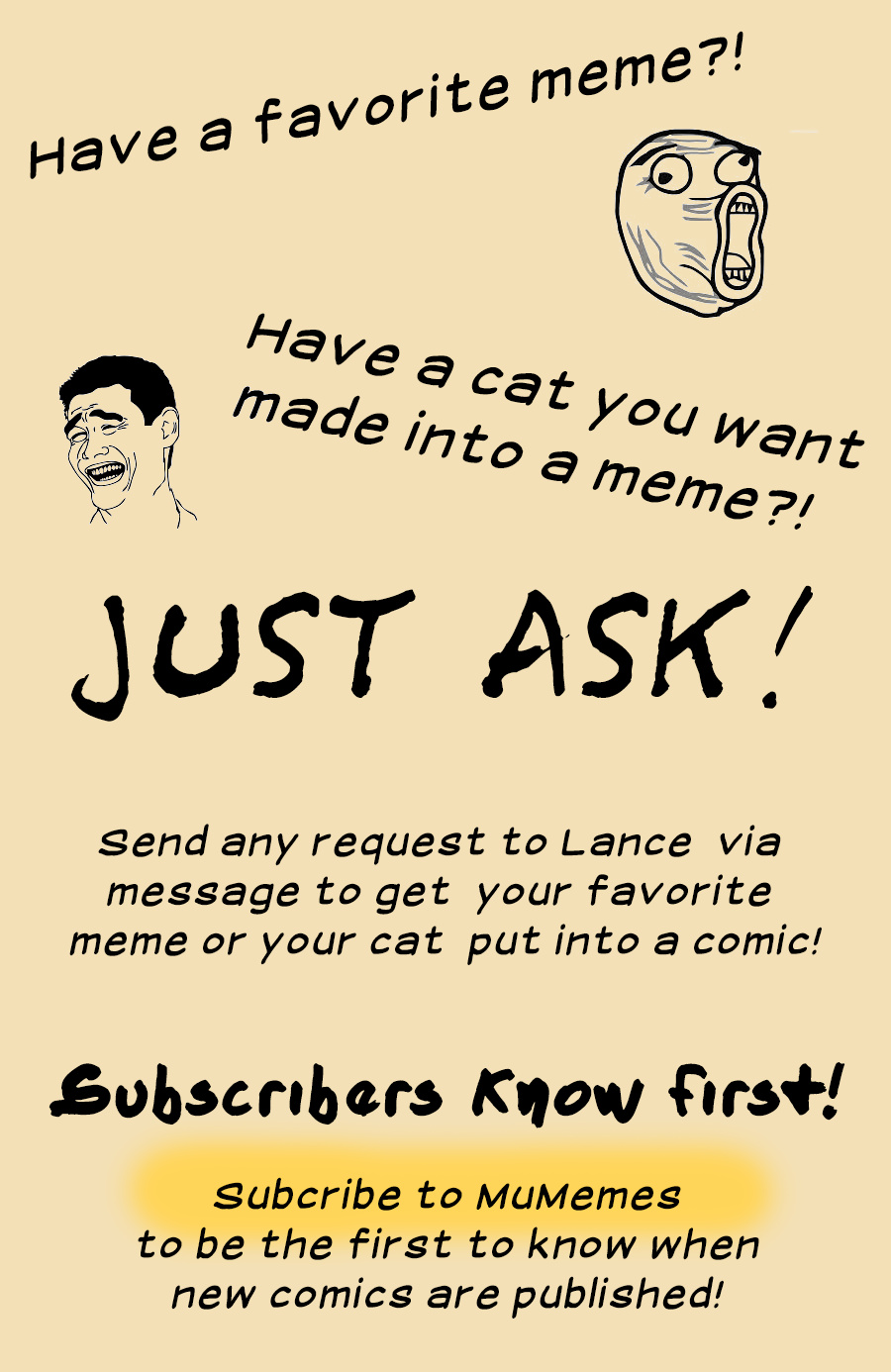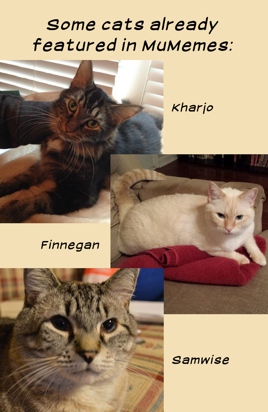 If you have a meme you'd like to see featured on MuMemes, or if you have a cat you'd like me to make into a meme, just message me or comment below. Pictured are three cats that have already been featured in MuMemes.