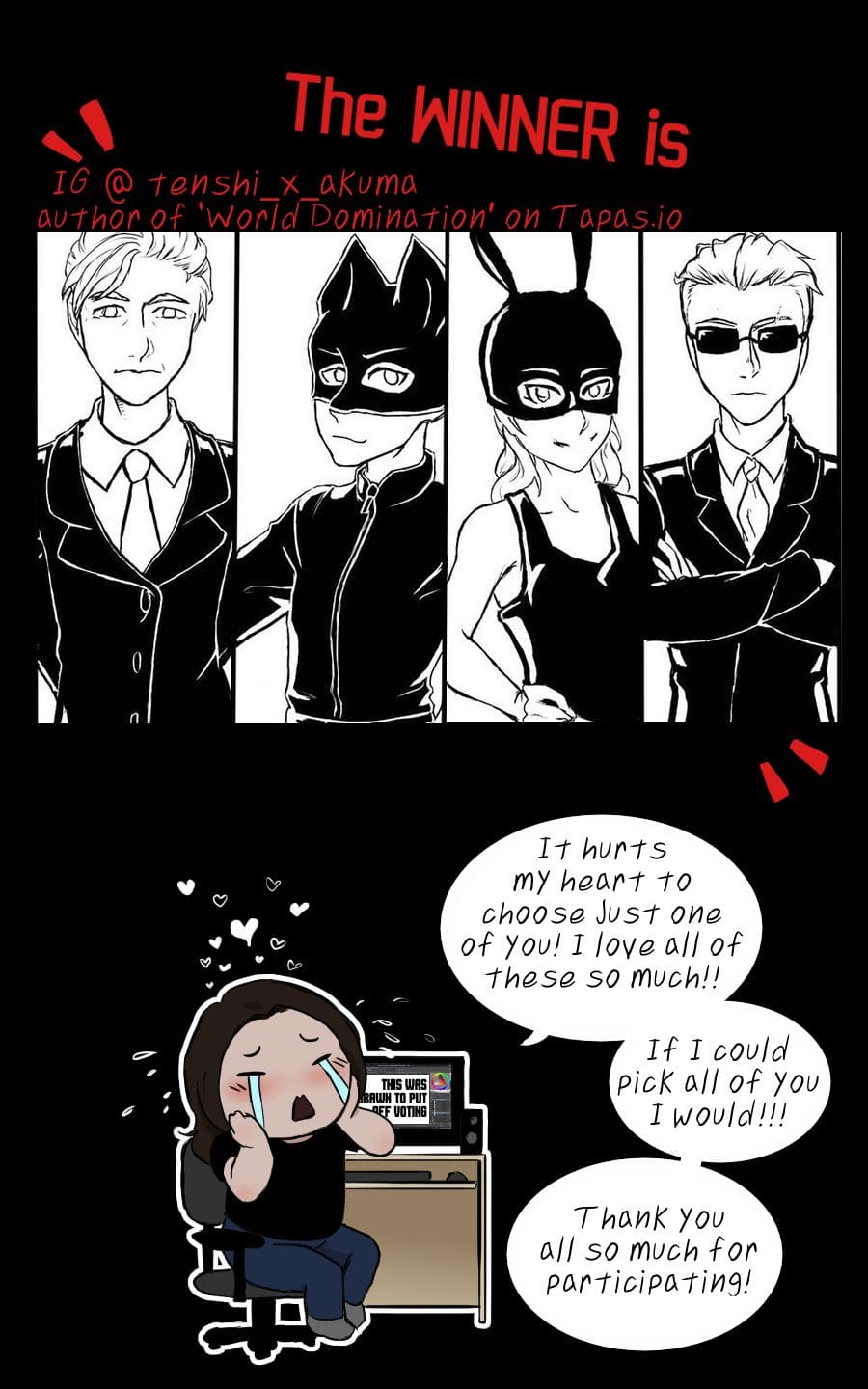 Thank you guys so much for participating in my Anniversary contest! I really do love all the art you made of my babies! And to those who didn't draw anything, thank you so much for supporting my comic by reading it! I love you all so much!! 。゚(゚∩´﹏`∩゚)゚。 -cries-