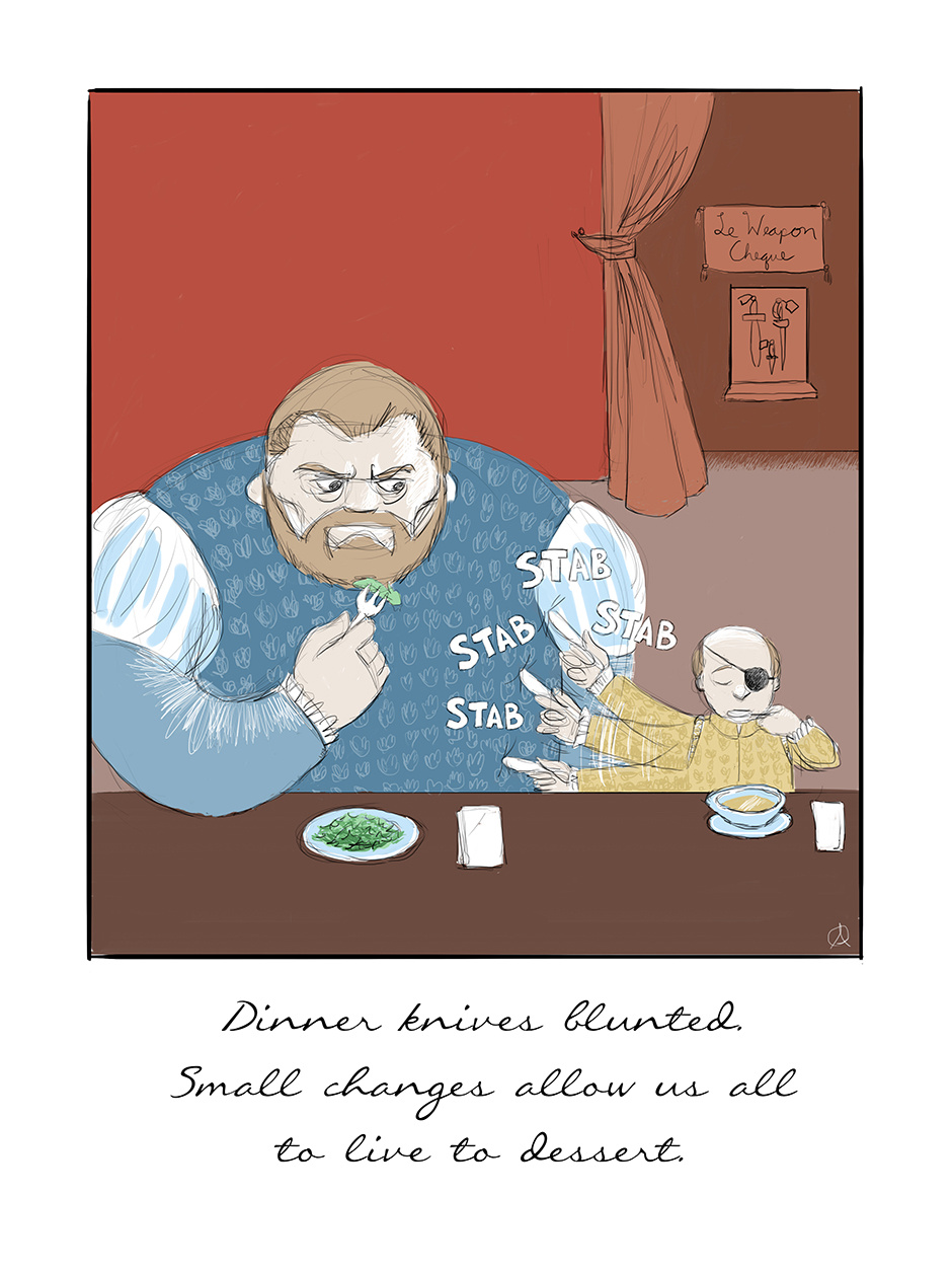 I'm not sure where I got this theory (probably from Wikipedia), but for some time I've believed that dinner knives were invented so that guests wouldn't need to have their own (sharp) knives on their person to eat a meal. This would mean less chance of stabbings when nobles got together.