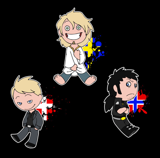 A week ago I realized that I have three Scandinavian guys as baddies, so I thought it would be fun to line them up like this. It felt amazingly good after having drawn the extremely stereotypical (and mainly nice) Scandinavians from SatW for so long. :D