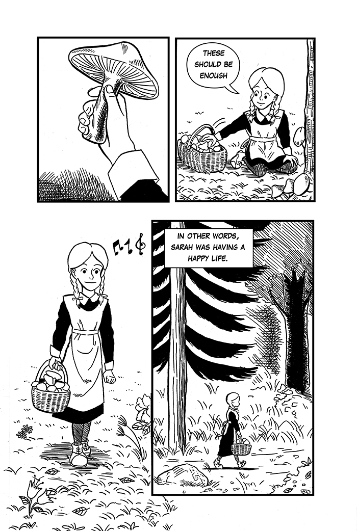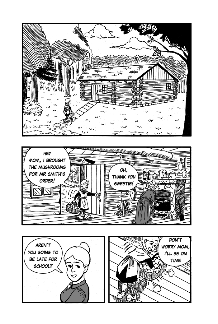 Hello! I hope you like the next pages. Here I introduce you to Sarah's daily routine. I really enjoyed drawing these, being the forest panels my favorites, and the cabin's interiors the hardest.