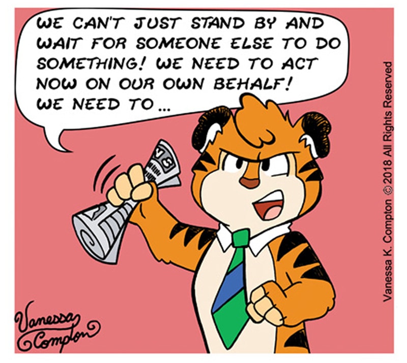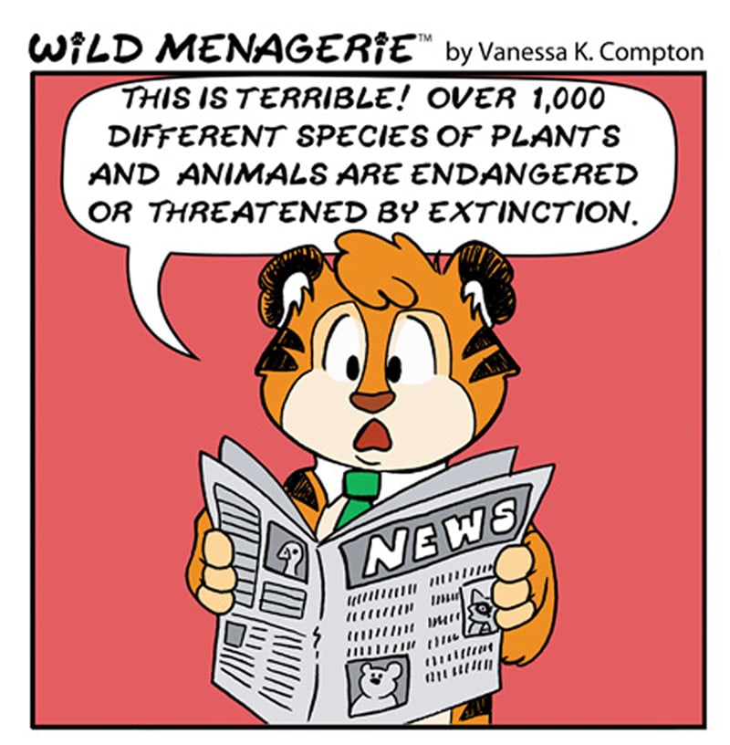 Wild Menagerie is a daily comic strip by Vanessa K. Compton about a collection of diverse animals living in a comfy rural town - far away from the threats many other species encounter every day in natural environments. These realities catch the attention of a group of friends who attempt to make a difference by forming the Endangered Species League. Their leader, Sidney, is an idealistic tiger who faces the challenges of balancing life with his Nana and getting his community to take action.