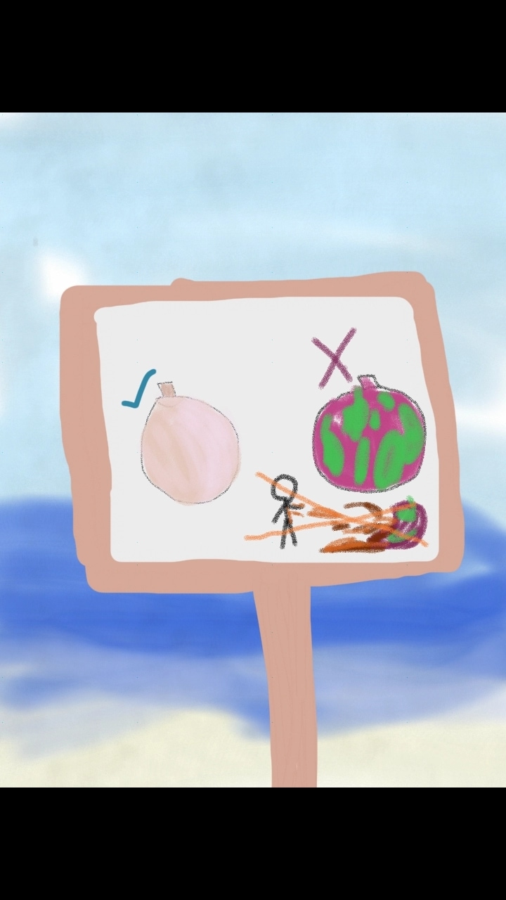 In this dream there was a beach that grew giant fruit (on the left of the sign). These fruit were big and nutritous so people would harvest them and sell them. However, these fruits grew next to a part of the ocean with dangerous chemicals in it. When the sun shone through the water onto the fruit the fruit would become toxic. It would turn bright pink and green and if someone touched it, it would explode and spray orange-brown stuff that burned anything it touched. So this sign warned about that. But it just confused people.