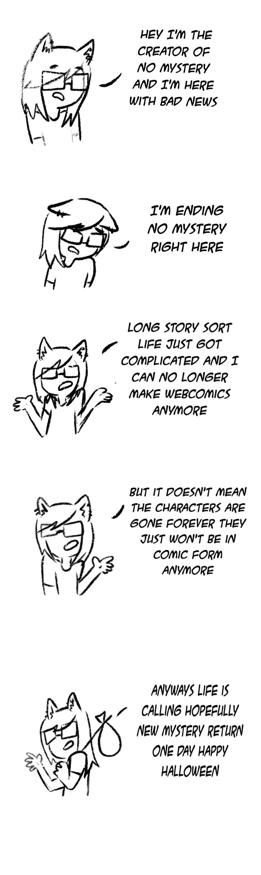 To explain more in-depth or to touch on the reason I am ending no mystery. Basically, I jumped into the comic without even fully finishing the idea of no mystery and I had no idea what I was doing at the time because I just jumped in without thinking about it. Now the karmic is slowly becoming my stress and I love my characters and I don’t want them to turn into my stress so I’m ending it here before a gets even more stressful for me to continue it. So I’m ending it here since I didn’t make too many comic strips. I wish I was able to introduce more like more characters I wanted to show or more things about there world but I knew it was best to end it here. I’ll leave some social media accounts if you want to see more of my characters. Thanks for everything goodbye.