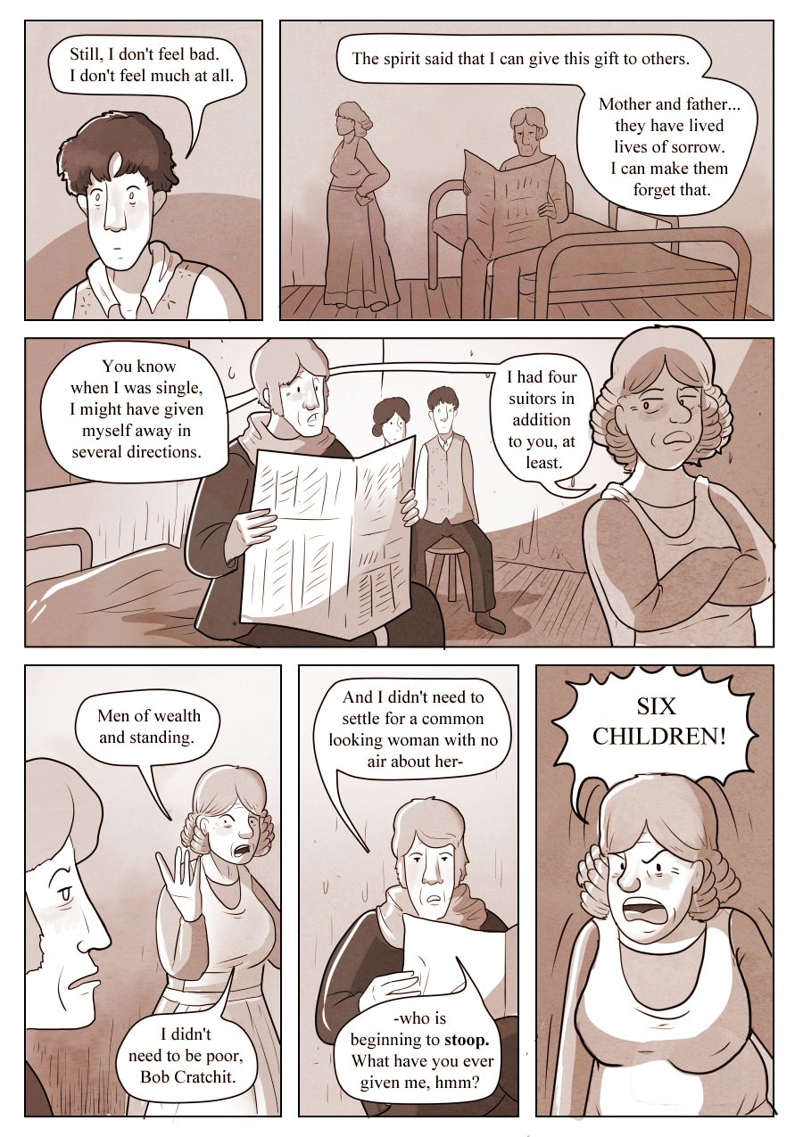 I pinched some of this dialogue from The Haunted Man, which has a similarly saccharine married couple who turn on each other due to to a similar curse.