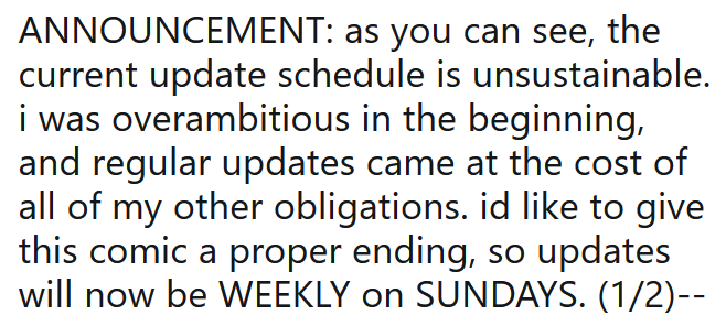 Tl;dr Comic updates on Sundays now! Thanks for reading, everyone. Tweet thread: https://twitter.com/cursecrush/status/1057166736246468608