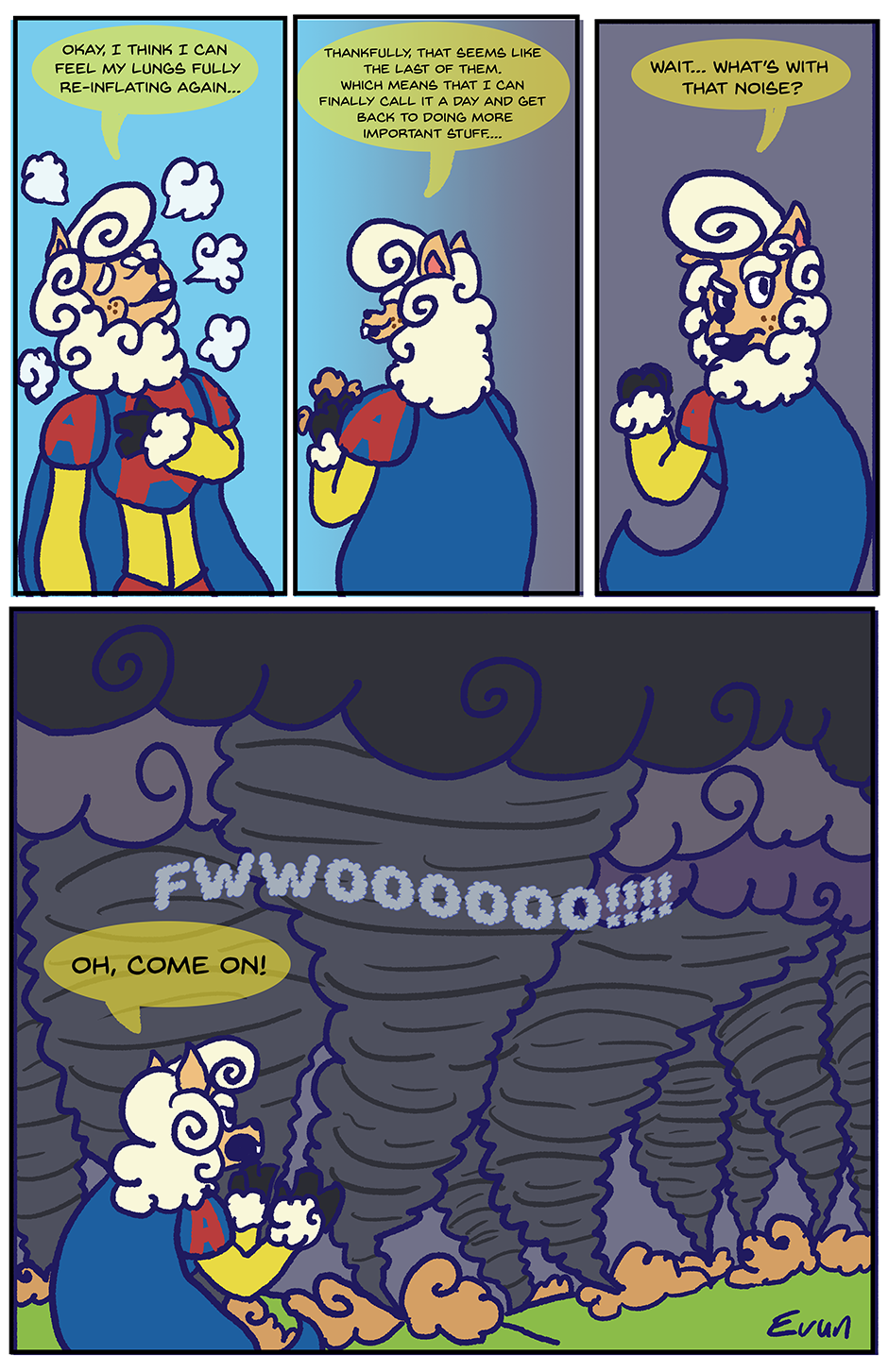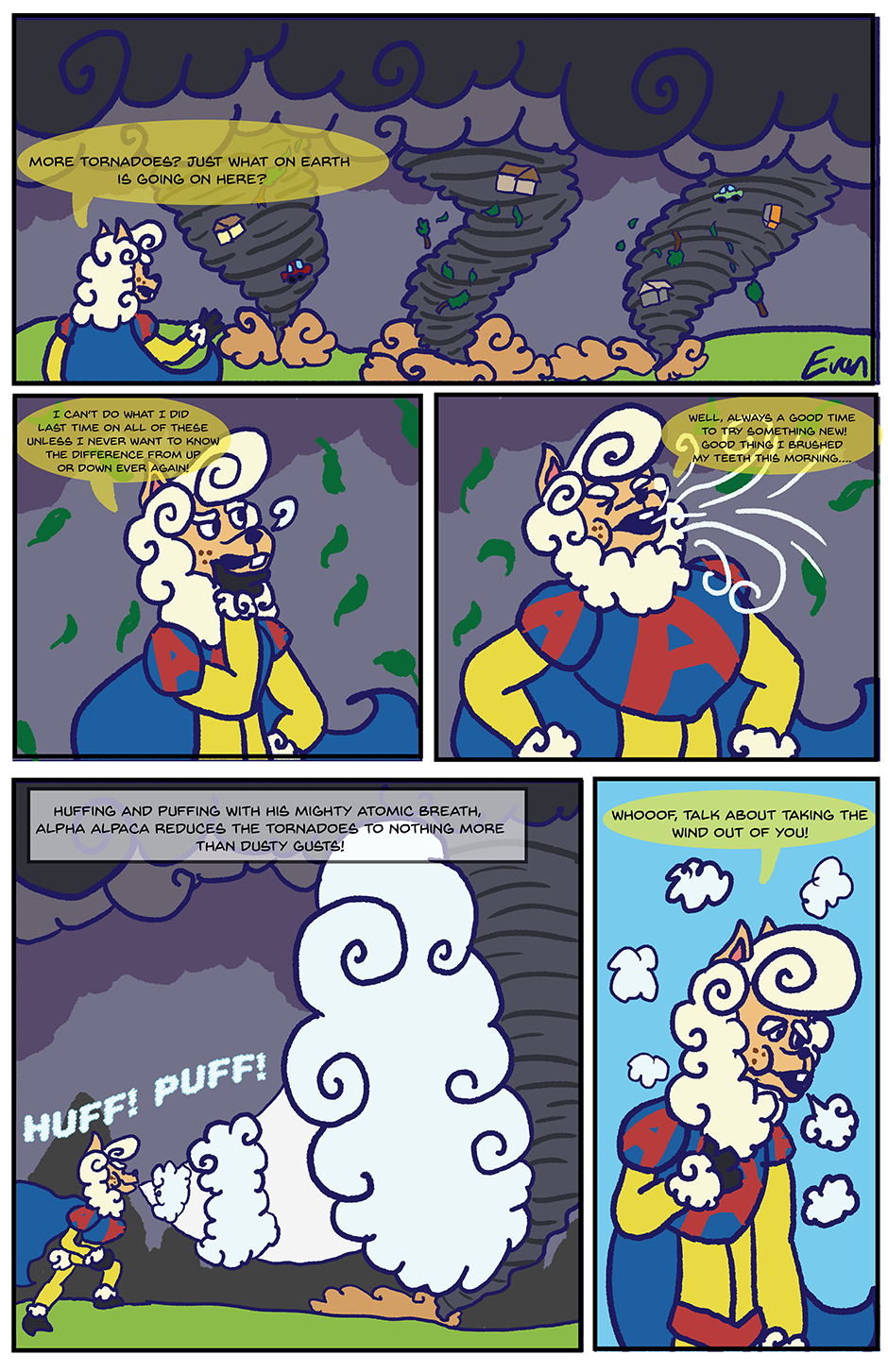 See? Told you he was windier than a tornado! His Atomic Hurricane Breath is vital in fueling his previously mentioned "Super-Boasting." It's his favorite power for that very reason. (That, and it's very useful for cooling drinks, drying clothes, cleaning the yard, and many other uses.)