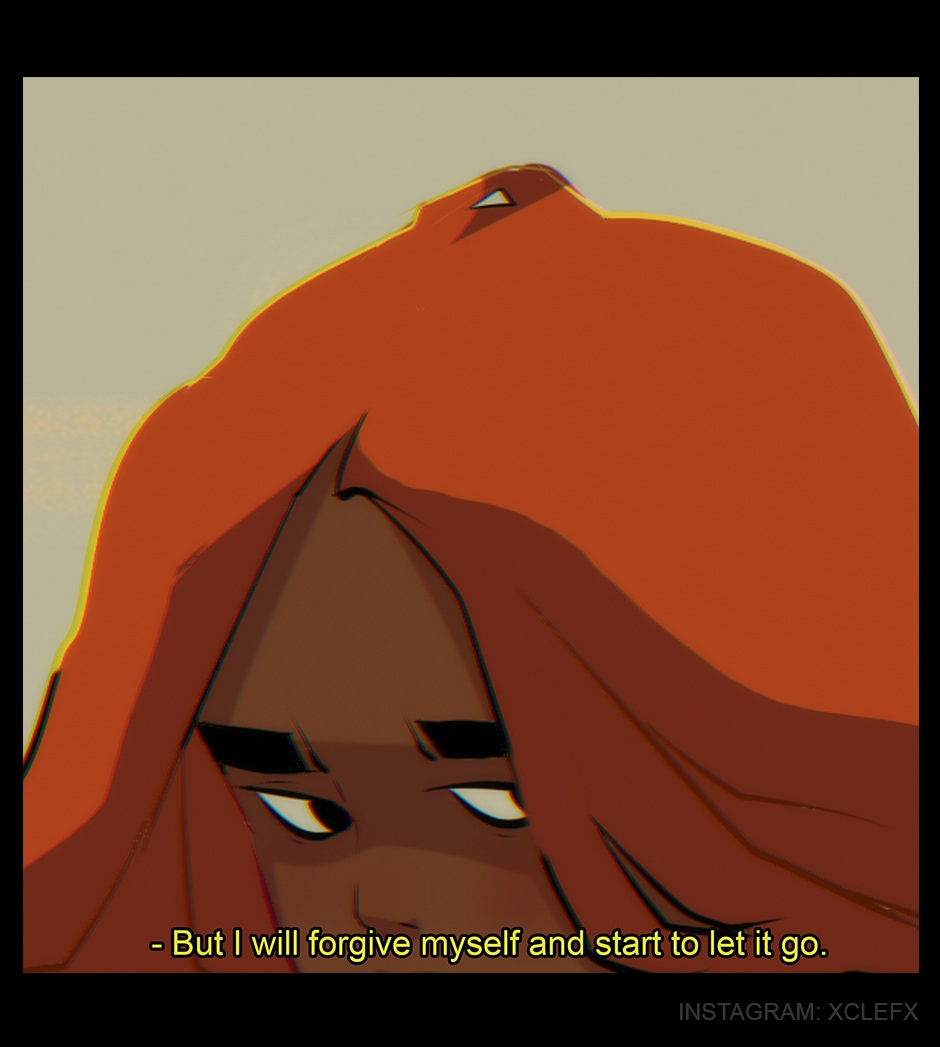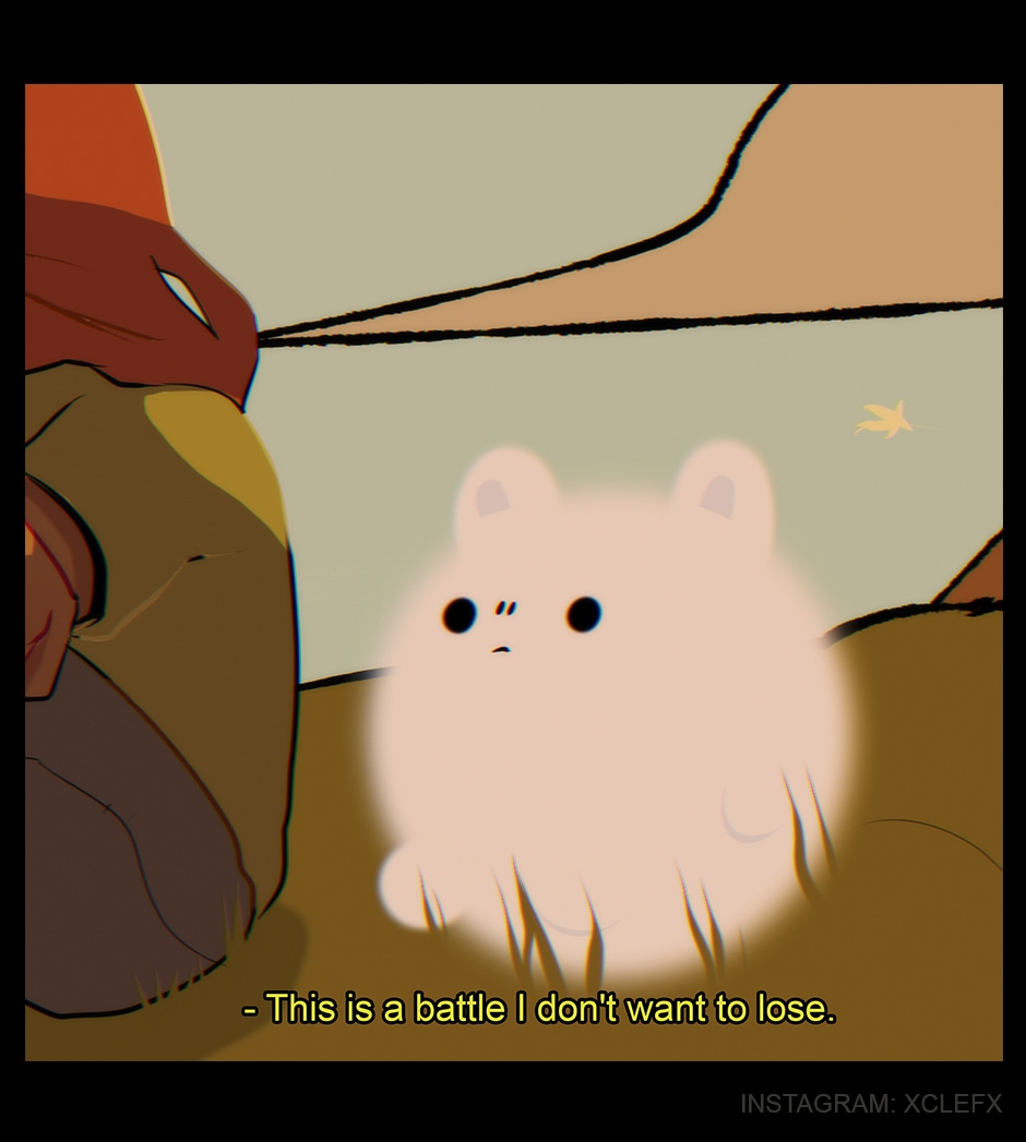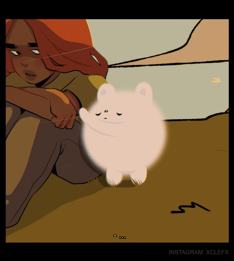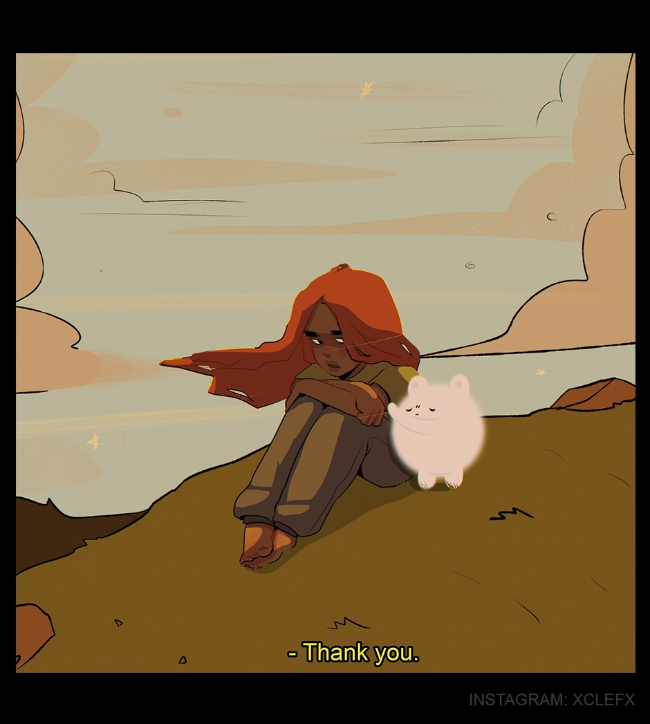 This is awesome. I full heartedly understand this girl, she's broken. Seen some crap. And the little bear floof just wants to be there for her. Very pleasing color schemes btw. Very nice and aesthetic.