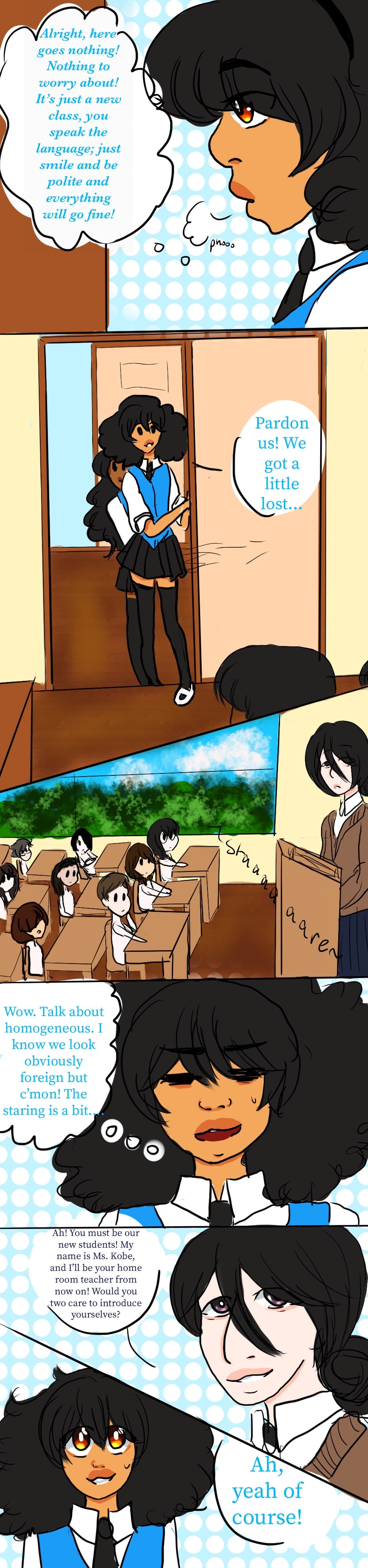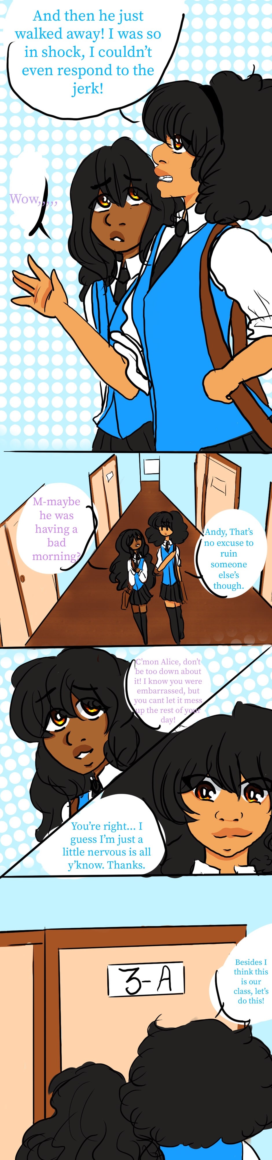Alice just wants to have a good day, Andromeda is shy, and the class likes to stare.