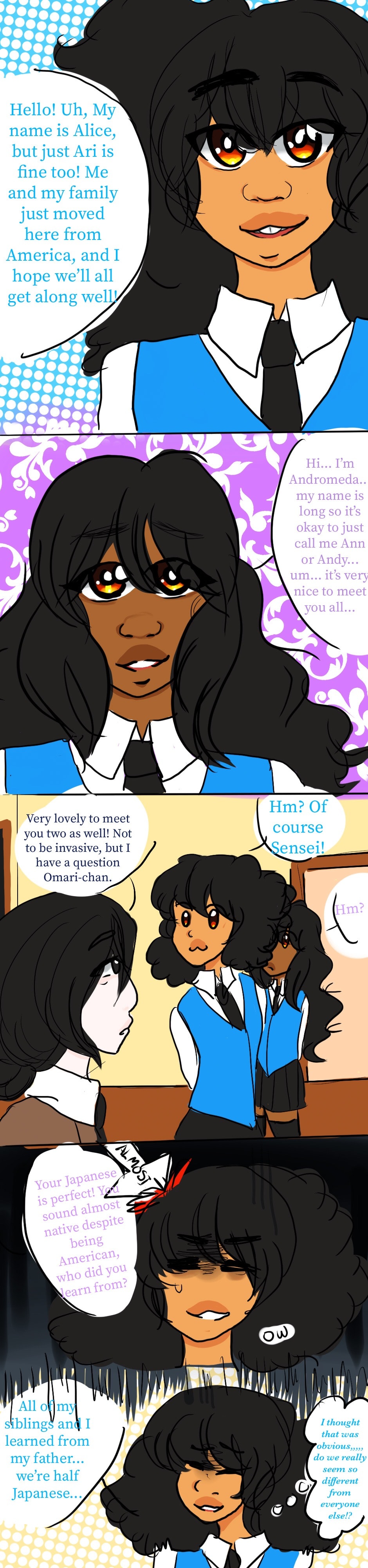 Alice and her family move to japan for her dad’s job. Alice and her siblings, Aleks and Andromeda, go about their new lives in this new environment. But when she crosses paths with stubborn and snarky Hiroka, things get a bit more complicated. This is a story about making friends, enemies, frenemies, and all the awkward and goofy antics expected from a bunch of high schoolers!