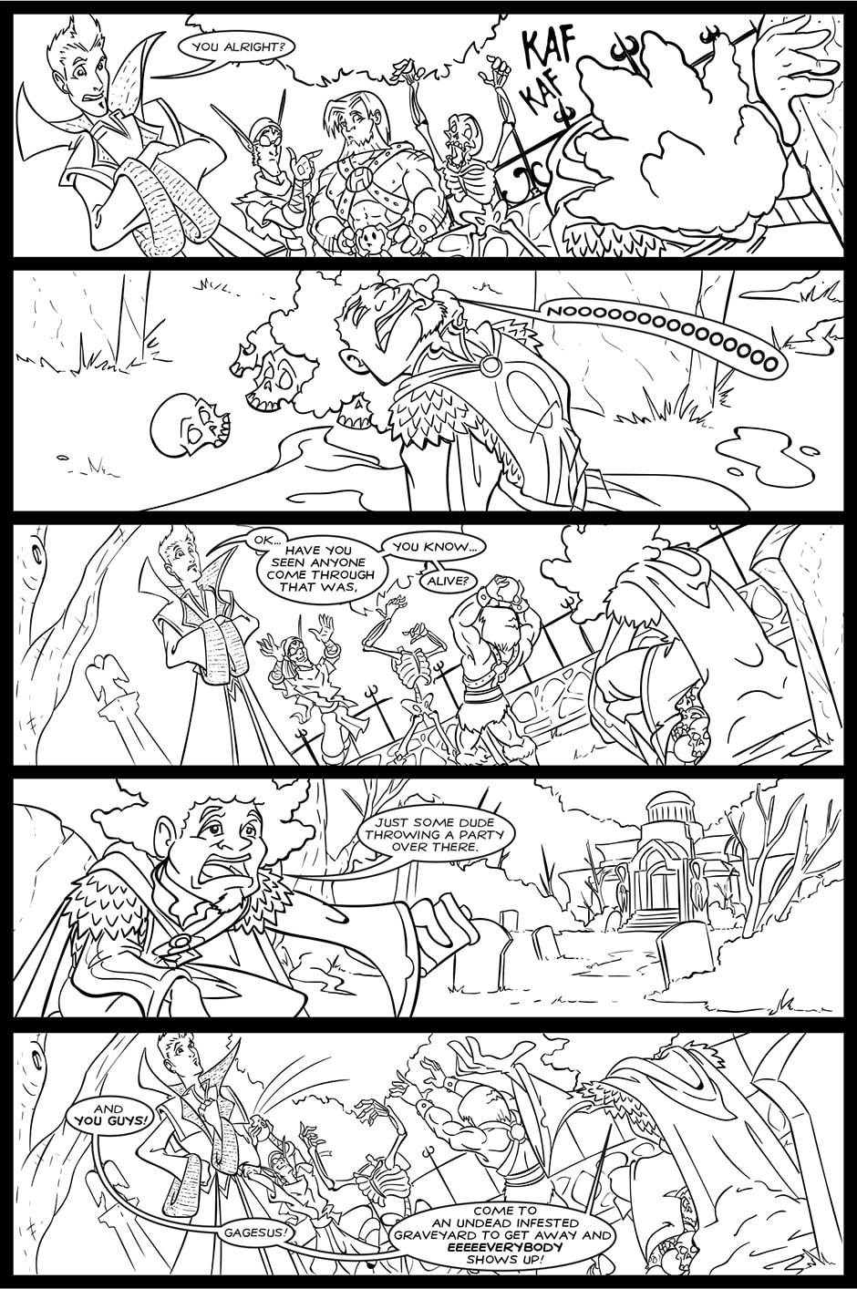 Battlements takes place in a fantasy world all on its own. Sword-and-board! Wizards-and-warriors! Bears-and-battle maces! Legendary creatures and adventurers gallivant across the lands seeking fame and fortune. Then there’s these jerks. Follow Hector, Shane, Rail, and Gene as they try to make a name for themselves as adventurers while staying alive.