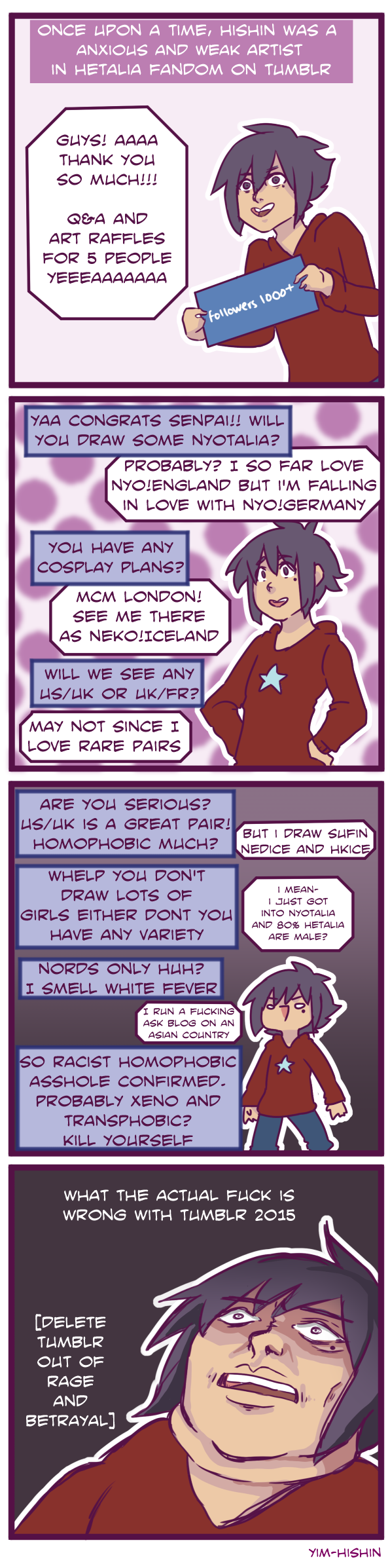 I was looking back at my old art and I saw my Hetalia fanarts from tumblr. Fucken sjw kids sent death threats to an anxiety driven suicidal me that I deleted my main blog for my own sane mind. Still went to therapy tho.