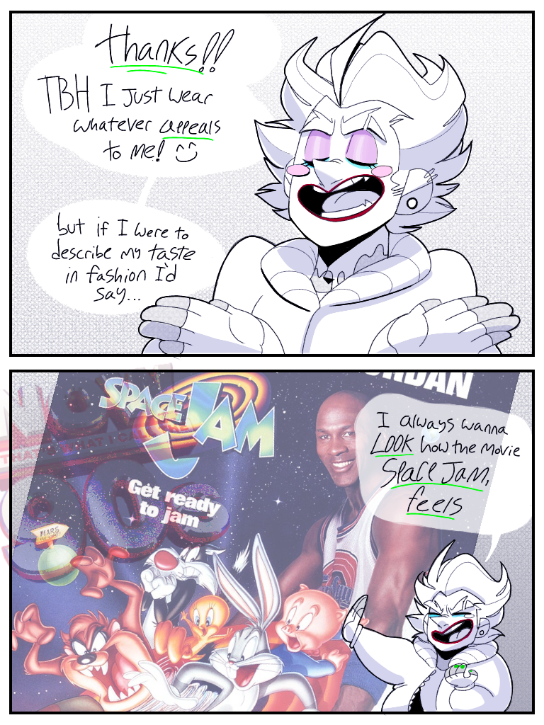 “I told Bats that once when he asked why I dressed this way... he didn’t know what Space Jam was, so, next time I get him all to myself, it’s movie night”