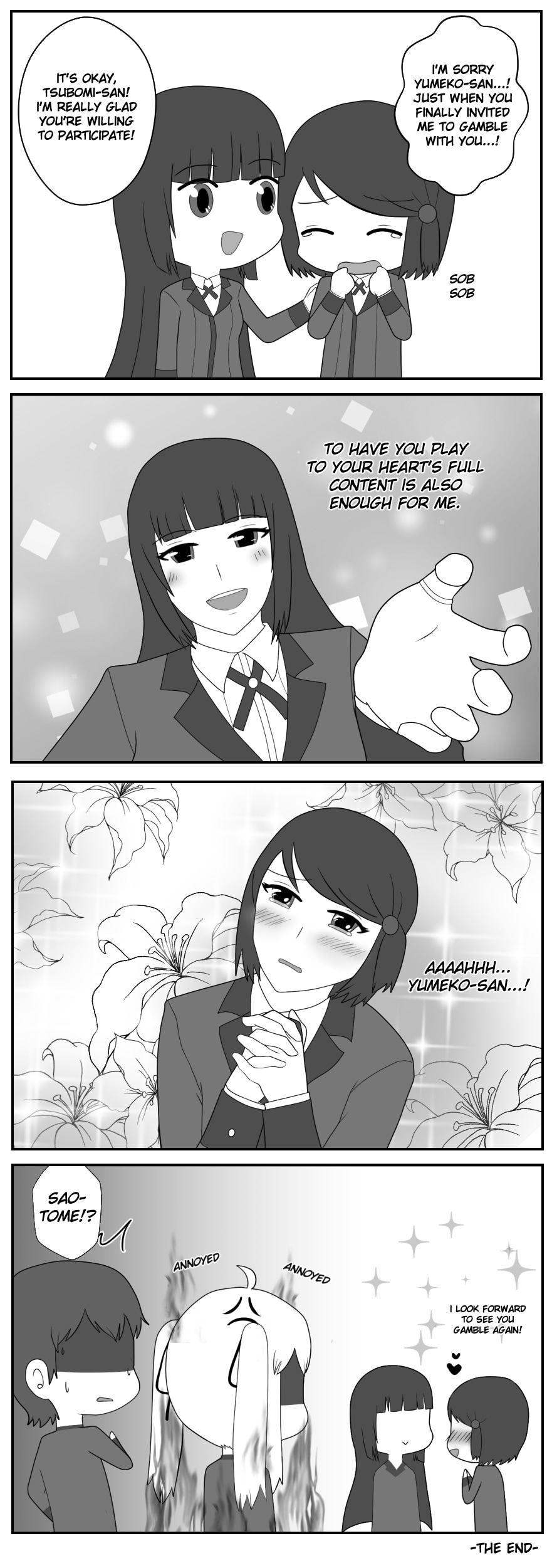 I mean, Yumeko did help her (Mary even acknowledges this) to regain her self-confidence to rebel against Kiwatari, so I'm pretty sure she admires Yumeko to a certain level. In this case, I increased that admiration to one little crush (you can say this is like an innocent version of Midari's fixation over Yumeko).