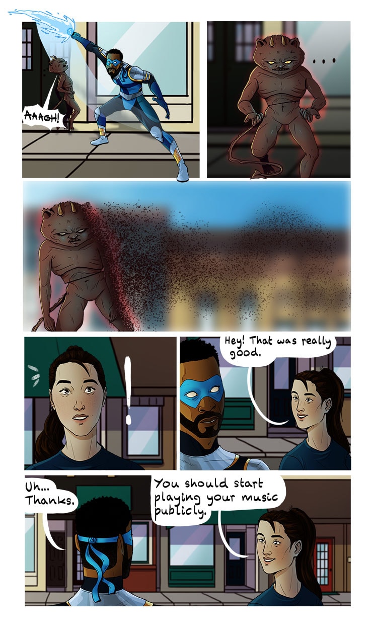 While at his new house, an anonymous package is delivered to his doorstep. He opens it to a mic, and with the click of a button his superhuman form is revealed! The mic becomes a blade of light and he inherits the ability to see beings of another realm affecting the present reality. Thus begins his journey to figure out what the heck is going on and why.
