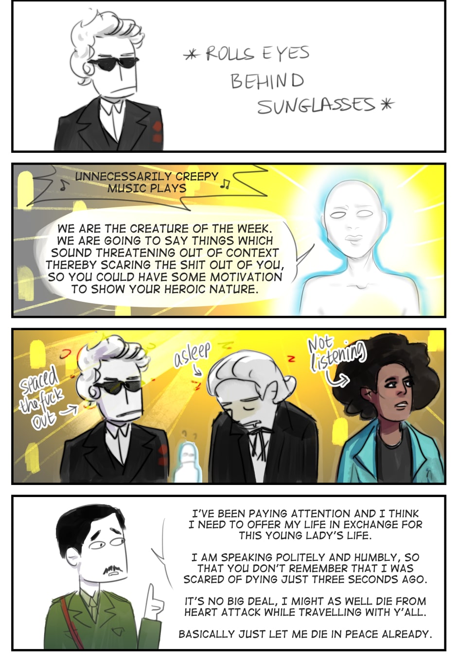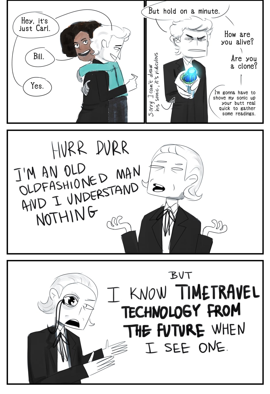 I started drawing parody fan fiction a few years ago because I loved Peter Capaldi's Doctor but hated Moffat's writing. I started with s08e01, but I haven't finished that one yet (oops), so here's the most recent stuff.