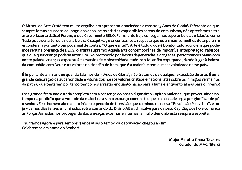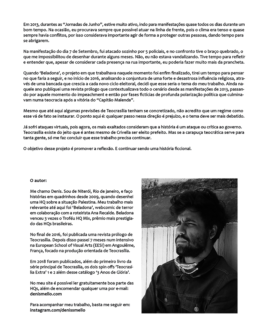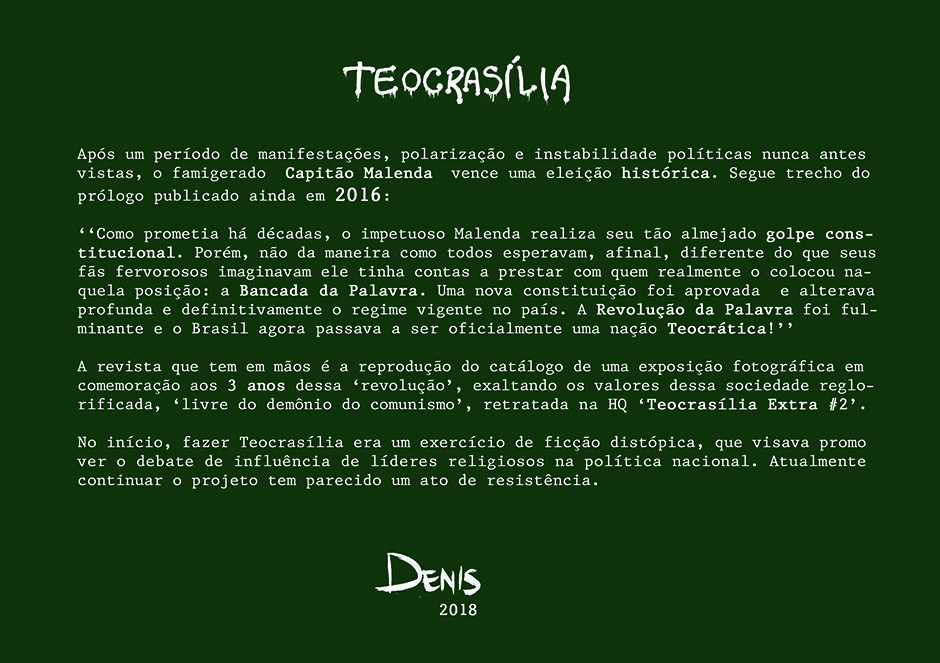 No início, fazer Teocrasília era um exercício de ficção distópica, que visava promover o debate de influência de líderes religiosos na política nacional. Atualmente continuar o projeto tem parecido um ato de resistência.