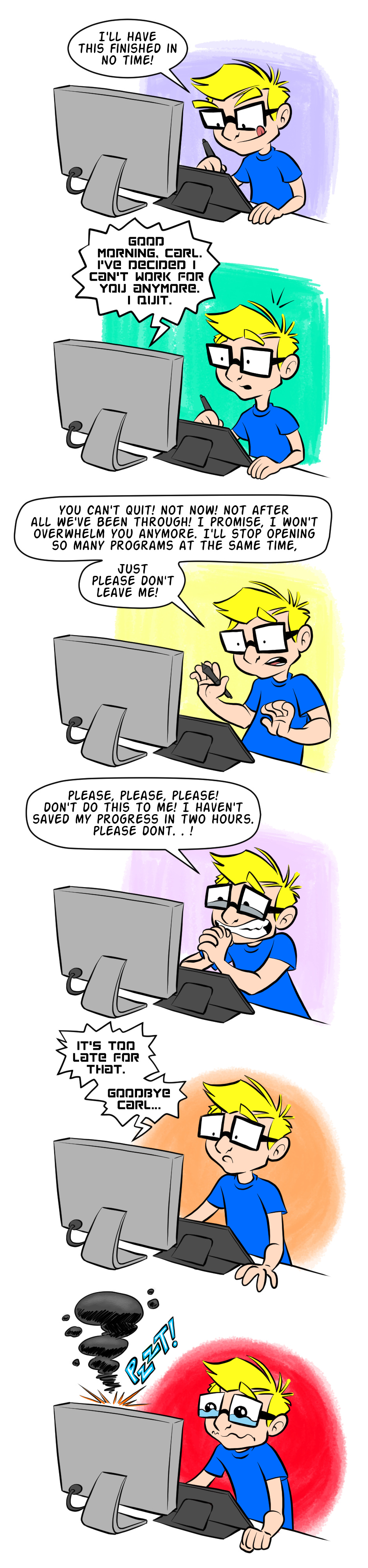 My computer quit on me the other day while I was drawing a "Dr. Sasquatch" comic ( http://tapastic.com/series/Dr-Sasquatch ). I hadn't saved at all since I started the comic (my bad) and my computer started to freak out, then shut down.