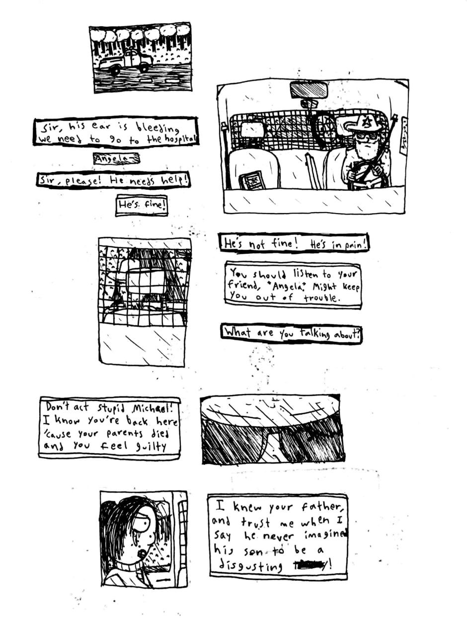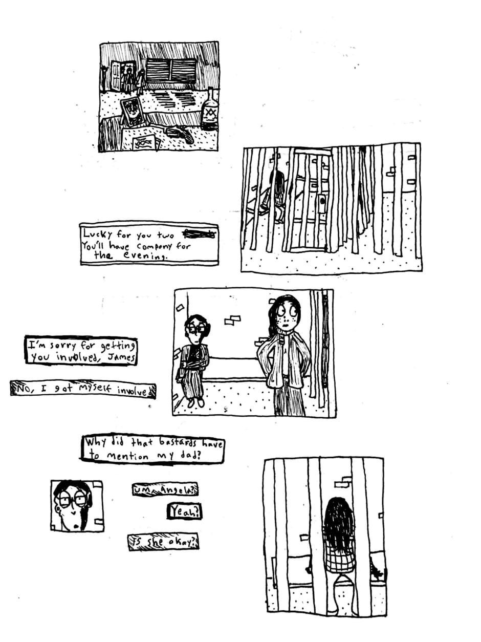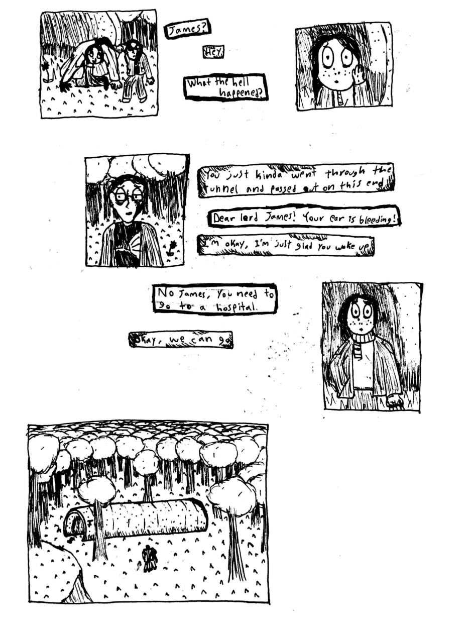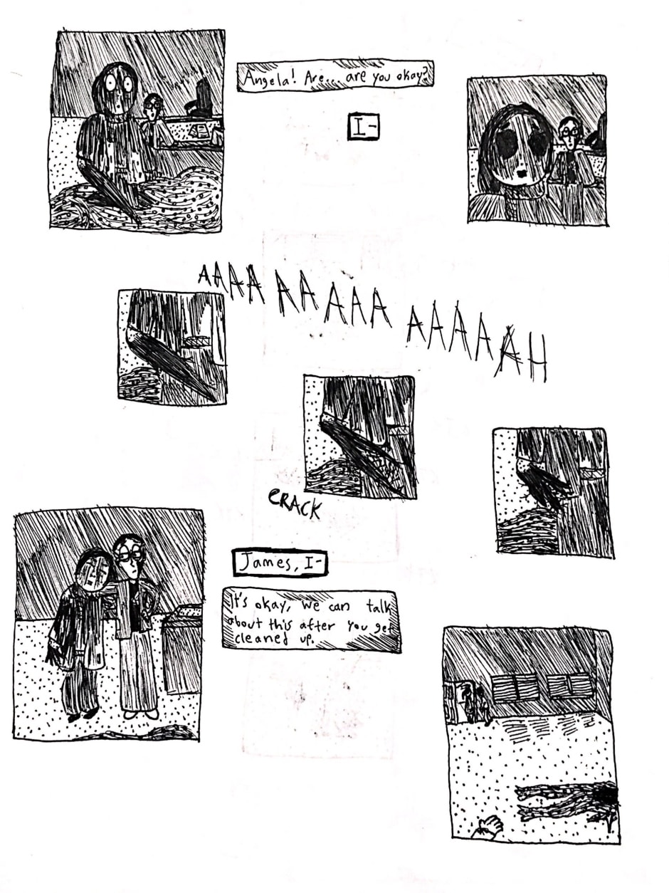 Angela is a webcomic created using ink and watercolor paint in order to portray a psychological and cosmic horror story about identity, childhood, and the nature of existence. The comic has a very bizarre, but intentionally personal, style, one that portrays scenes in subjective snapshots that help communicate the perspectives of these characters. Major influences for this work include: Stephen King, Jorge Luis Borges, Franz Kafka, Neil Gaiman, Junji Ito, Thomas Ligotti, and Edward Gorey.