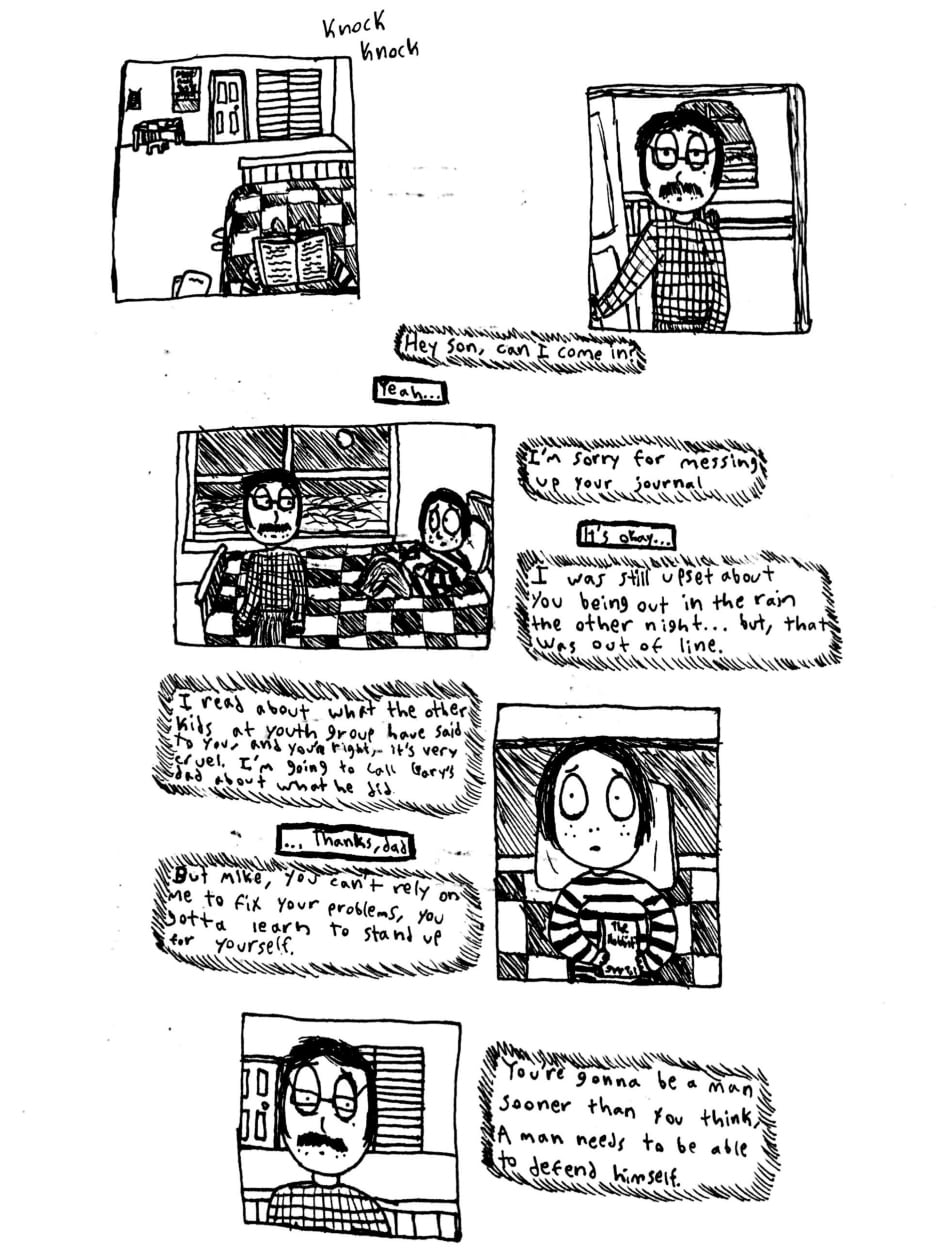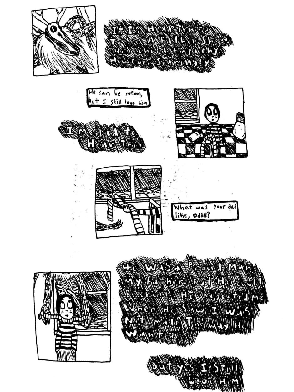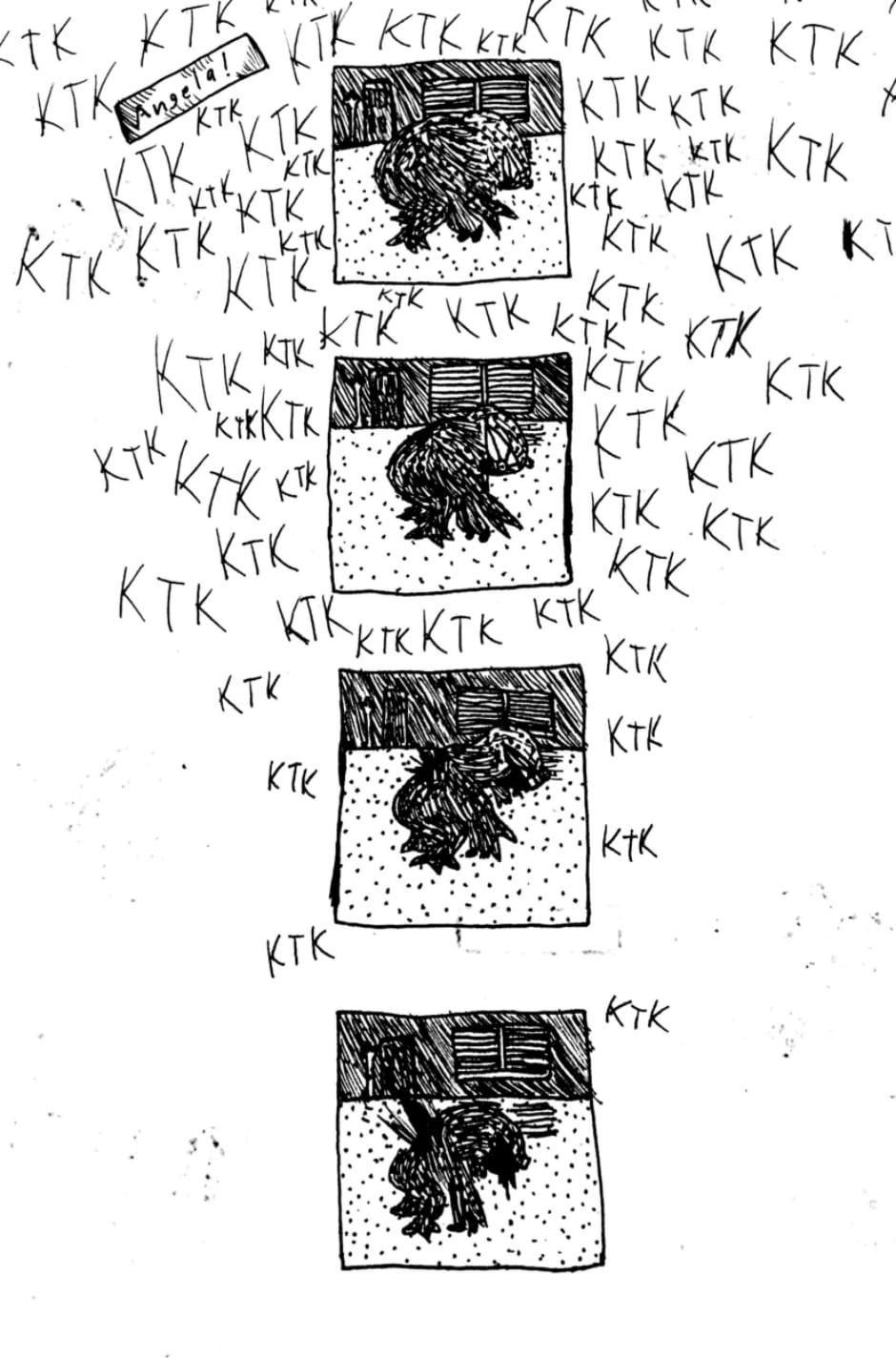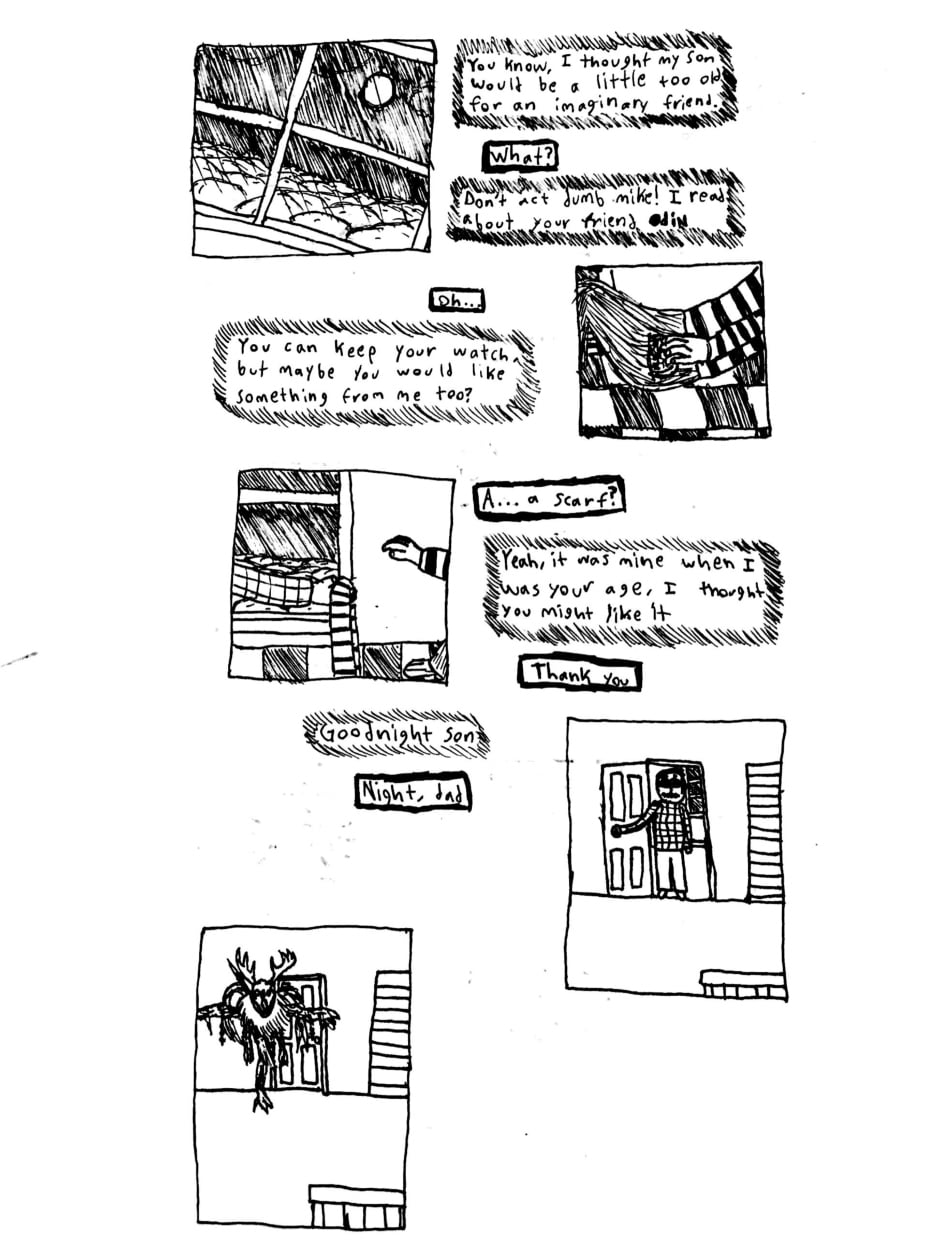 Angela is a webcomic created using ink and watercolor paint in order to portray a psychological and cosmic horror story about identity, childhood, and the nature of existence. The comic has a very bizarre, but intentionally personal, style, one that portrays scenes in subjective snapshots that help communicate the perspectives of these characters. Major influences for this work include: Stephen King, Jorge Luis Borges, Franz Kafka, Neil Gaiman, Junji Ito, Thomas Ligotti, and Edward Gorey.