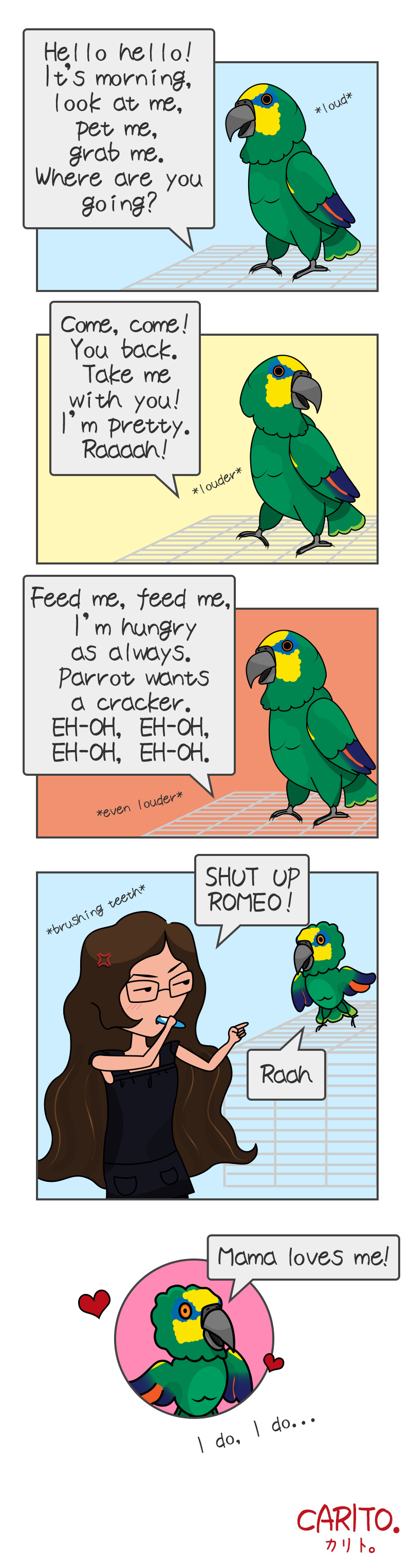 Romeo is my parrot, he has destroyed a pair of shoes, some earphones and a pillow so far this 2 months... I love him but he's loud!