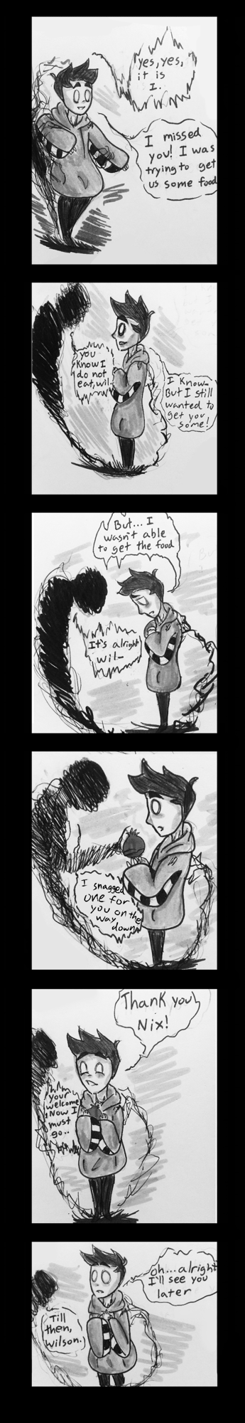 Meanwhile, the young boy named Wilson is wandering around in the realm he was taken to, being forever watched and cared for by an unknown entity he simply calls ‘Nix’. Despite being protected Wilson gets into mischief often, being quite the handle for ‘Nix’ as he tries his best to keep him safe.