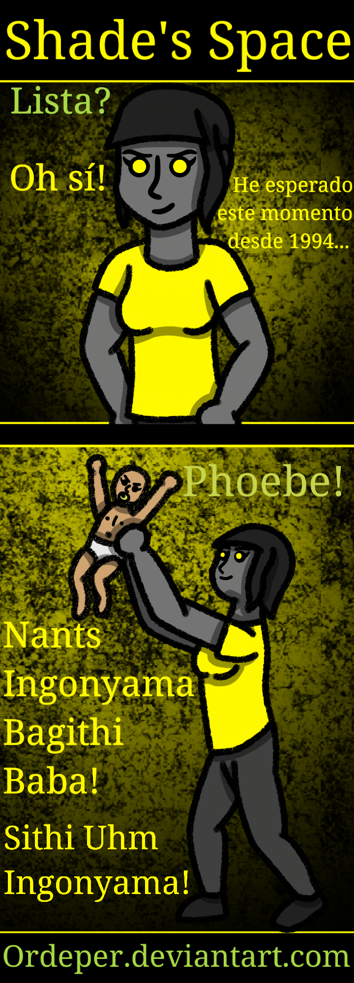 Pett: -Ready? Shade: -Oh yeah! I've waited for this moment since 1994... Phoebe! Shade: -Nants ingonyama Bagithi Baba! Sithi Uhm Ingonyama!