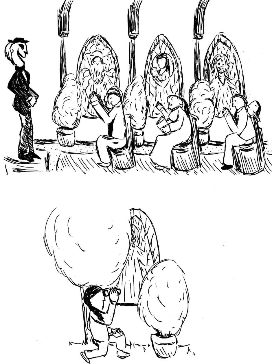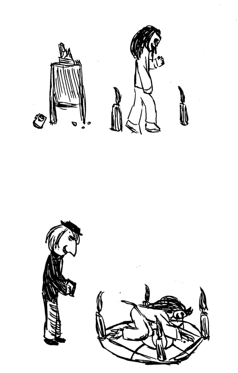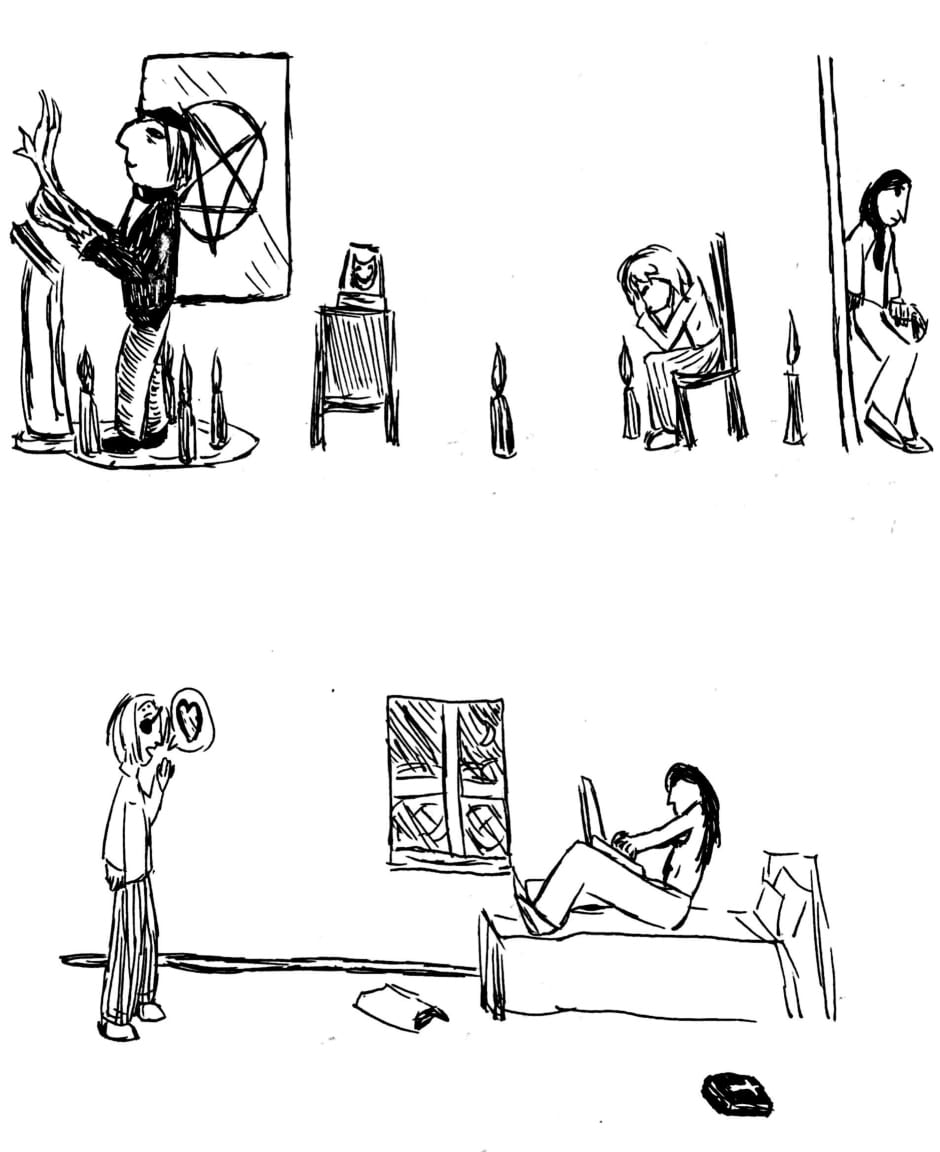 Angela is a webcomic created using ink and watercolor paint in order to portray a psychological and cosmic horror story about identity, childhood, and the nature of existence. The comic has a very bizarre, but intentionally personal, style, one that portrays scenes in subjective snapshots that help communicate the perspectives of these characters. Major influences for this work include: Stephen King, Jorge Luis Borges, Franz Kafka, Neil Gaiman, Junji Ito, Thomas Ligotti, and Edward Gorey.