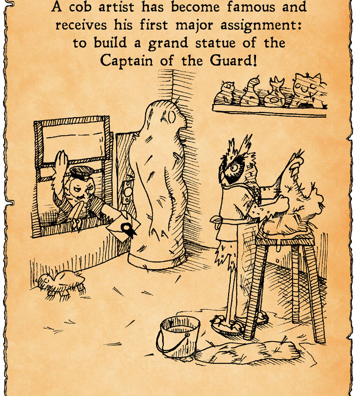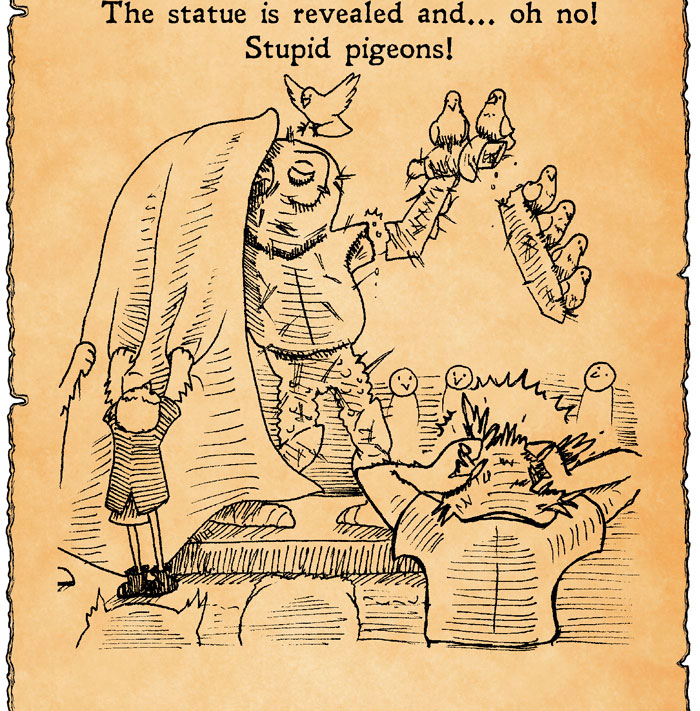 I was a little nervous about drawing the night sky in the last panel, but it actually came out rather nice. As long as it is evident that the poor fellow is spending a night making adjustments to the statue. Her work actually paid off, since the contraption has now been standing there a few months without tumbling down. Personally, I think the statue looks way more magnificent now. There is just something very intriguing with how it all stays intact.