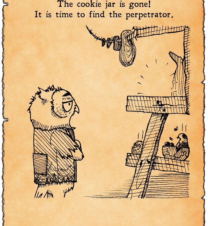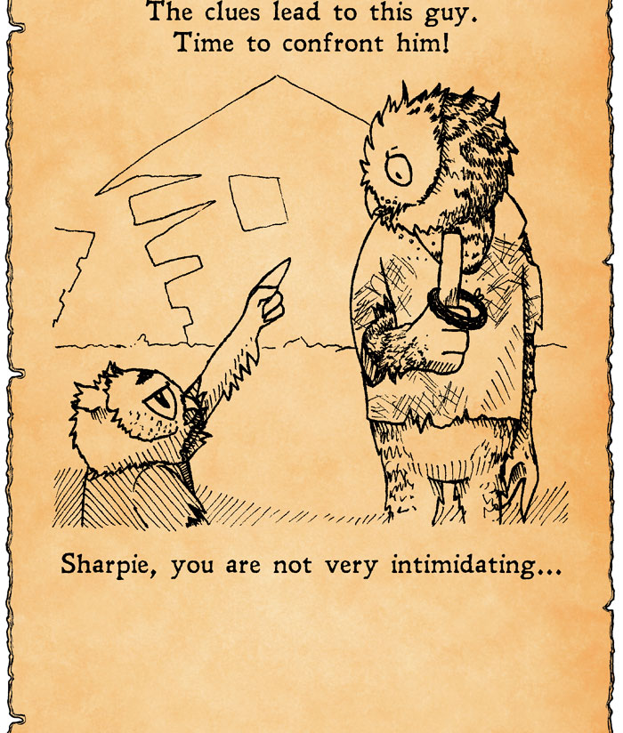 Sharpie's pair of giant eyes made me very nervous when we were investigating his way of life. I felt he was constantly watching us, even when his back was turned. Still, he did nothing to chase us away. Or even acknowledge our presence. He seemed to be more concerned about the cookie mystery, anyway.