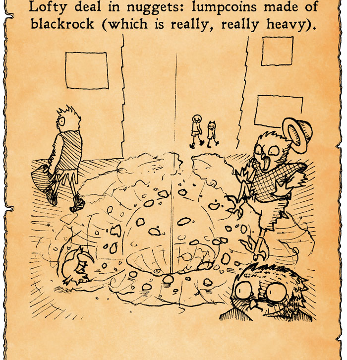 We are yet to see a nugget ourselves, so I had to draw from descriptions again. The nuggets that sometimes plummet down to ground are quickly retrieved or hunted down if a commoner decides to take one home. We do not know why the lofty are so crazy protective over money they do not seem to want to own. It is possible they simply do not want us commoners to touch their stuff.