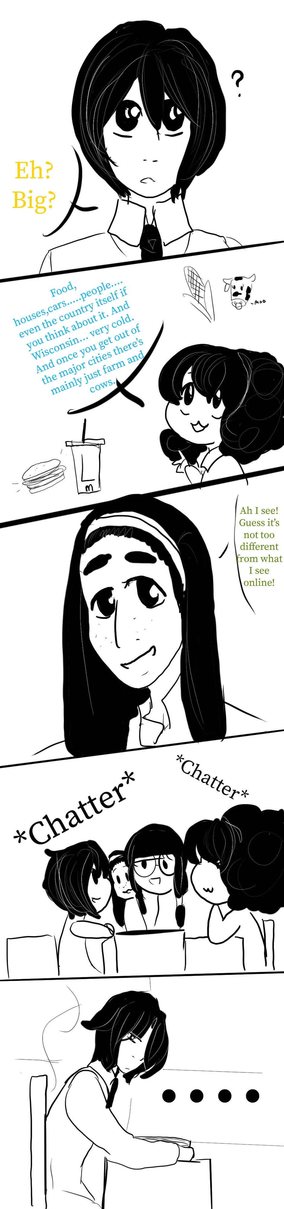 Alice chats with her friends, the brooding emo in the corner has been identified, Alice try’s not to punch him.