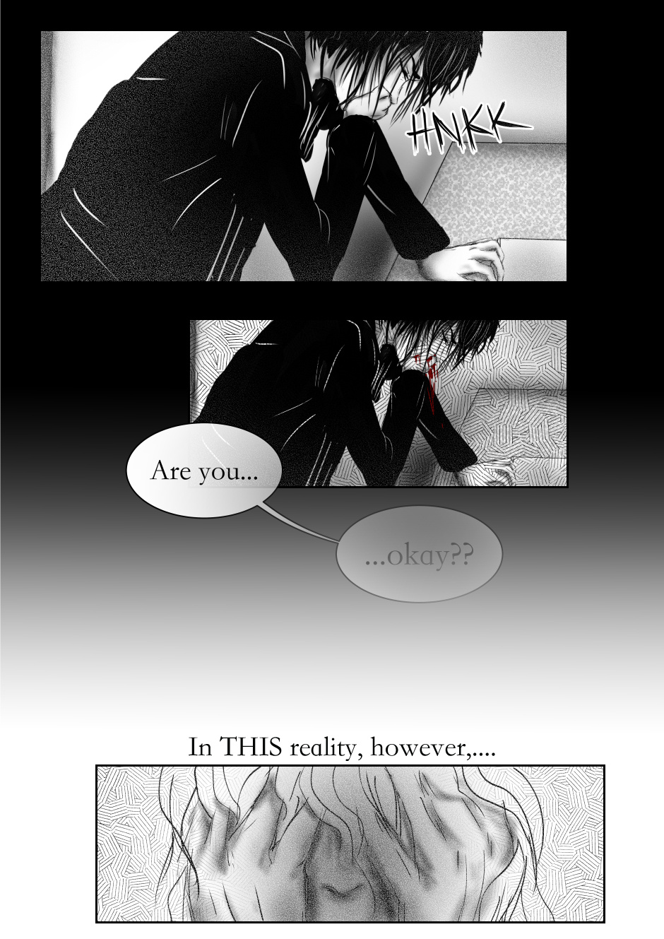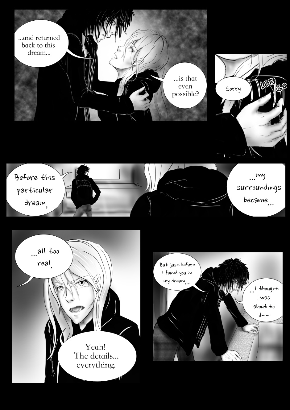 Wait... You know how they said if people they know have demented versions; And the demented versions are believed to be free... What happens when they die in their non-demented version that is in the 'real world'? Would they die for real? And he thinks he was about to die before he found her... Does that mean he was also experimented on... Or was he just going to die? Wait. He thinks he was about to die... Her friend commited suicide... What if the dream world is for people who have the same dream-length... That have or are close to death...? And is that a blush I see on his face on the first panel? *Insert smirky face here* (Ignore the fact that he's coughing up blood, and that she's having breathing problems. The ship is taking sail.)