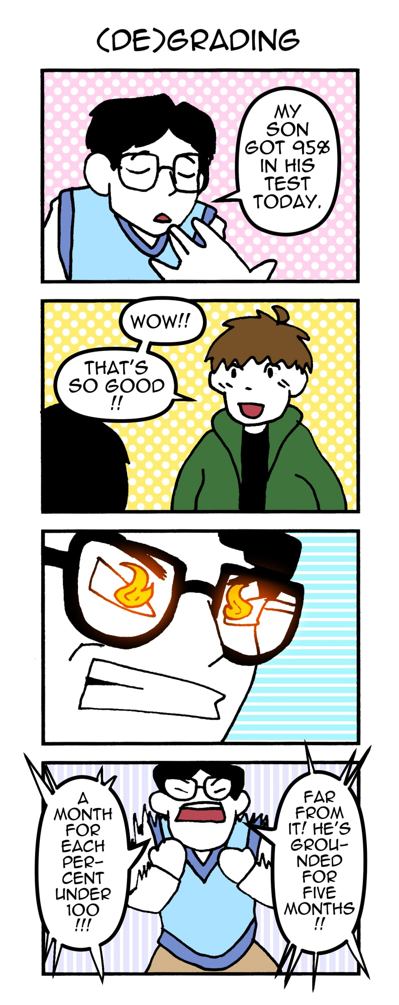 DAD SCHOOL is a high-school gag manga parody, collecting strips about a SCHOOL FOR DADS. Lessons? Dad jokes. Uniform? SOCKS AND SANDALS, DUH. Meet a whole school of PURE TESTOSTERONE!!! Except there’s that dad who doesn’t stop crying, and that dad who isn’t actually a dad yet – hey, he’s the character you follow! What’s up with that?!