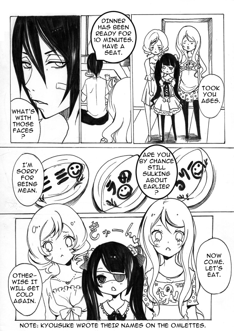 Note: Kyousuke wrote everyone's name on their omlett.