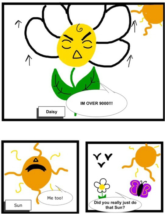 A comic about the odd adventures of Daisy and her friend the Sun. Daisy has this weird curly thing flowers probably shouldn't have.... The Sun has one eye and this odd and conspicuous triangle on his forehead. Later on Daisy will meet other flowers, plants and whatever the crazy author thinks of!