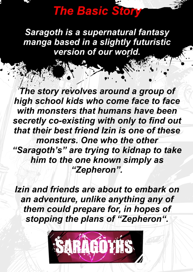 The story revolves around a group of high school kids who come face to face with the monsters that humans have been secretly co-existing with only to find out that their best friend Izin is one of these monsters. One who the other “Saragoth’s” are trying to kidnap to take him to the one known simply as “Zepheron”. Izin and friends are about to embark on an adventure, unlike anything any of them could prepare for, in hopes of stopping the plans of “Zepheron“.