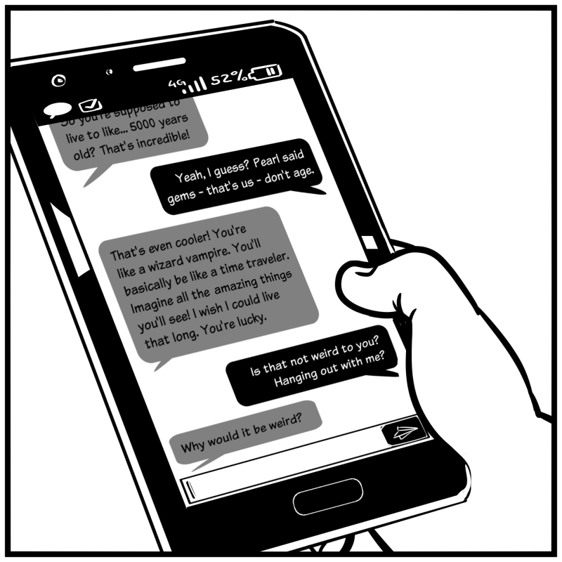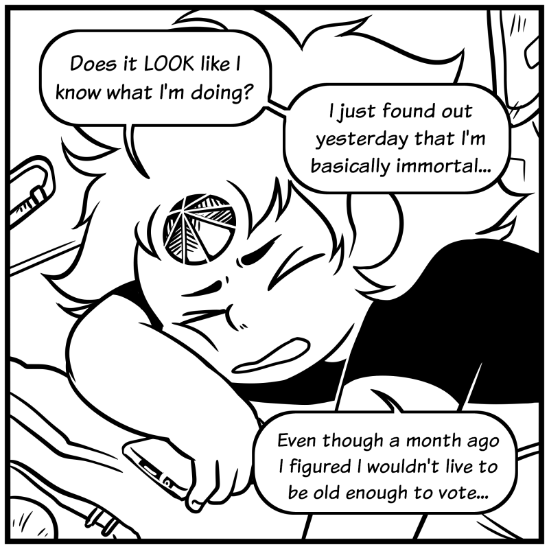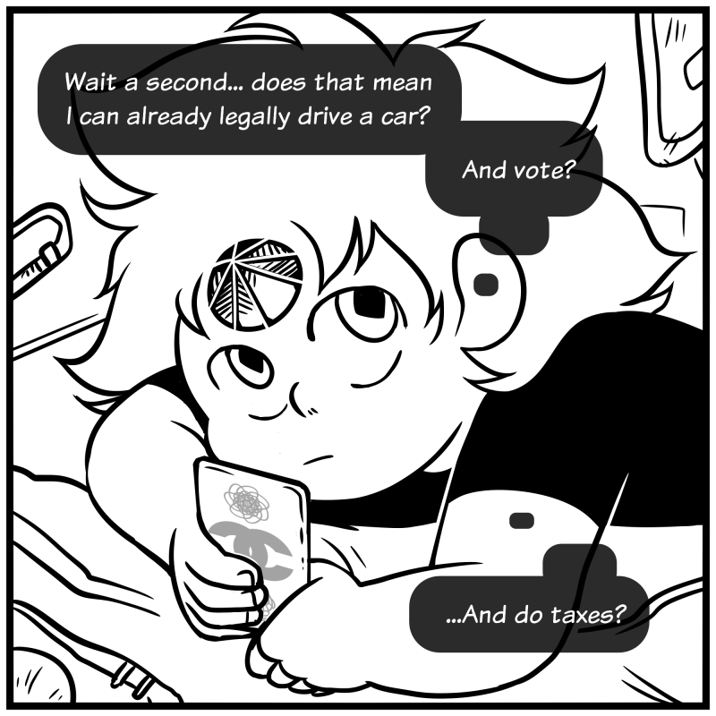Average teenager: Wait, I could be hundreds of years old?...I can drink, be out as late as I want, no one can tell me what to do! Steven: Wait, I could be hundreds of years old?...I can vote and do taxes!