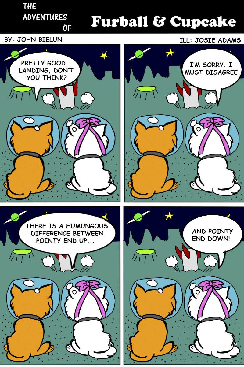 Meet Furball and his partner, Cupcake. Two quirky cats who would go on adventures from normal to wacky. Even though you will only see the backs of them and they don't move much, their one-liners and personalities will make up for that. The stories are by John Bielun and the illustrations are by Josie Adams. This comic will also be uploaded three times a week.