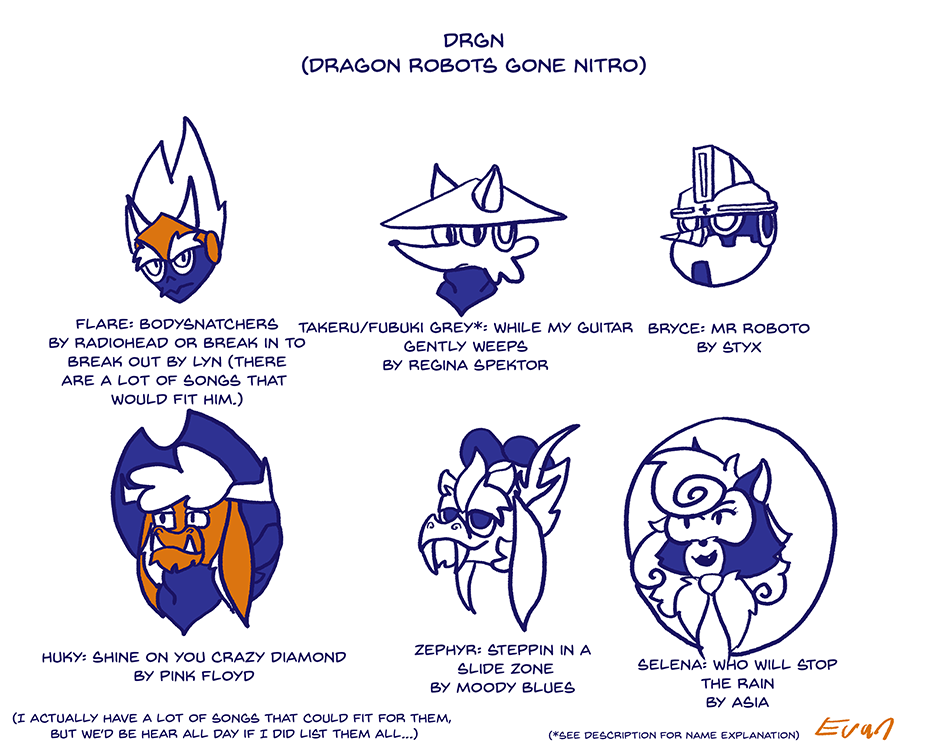 (*EXPLANATION: The reason why Takeru is now listed as Fubuki is because I decided that for DRGN proper to replace Takeru Grey with a girl named Fubuki Grey to help balance the starting team more. Seeing as I already established Takeru in other places, I decided to keep both names here for now to hopefully prevent confusion. Sorry for the inconvenience.)